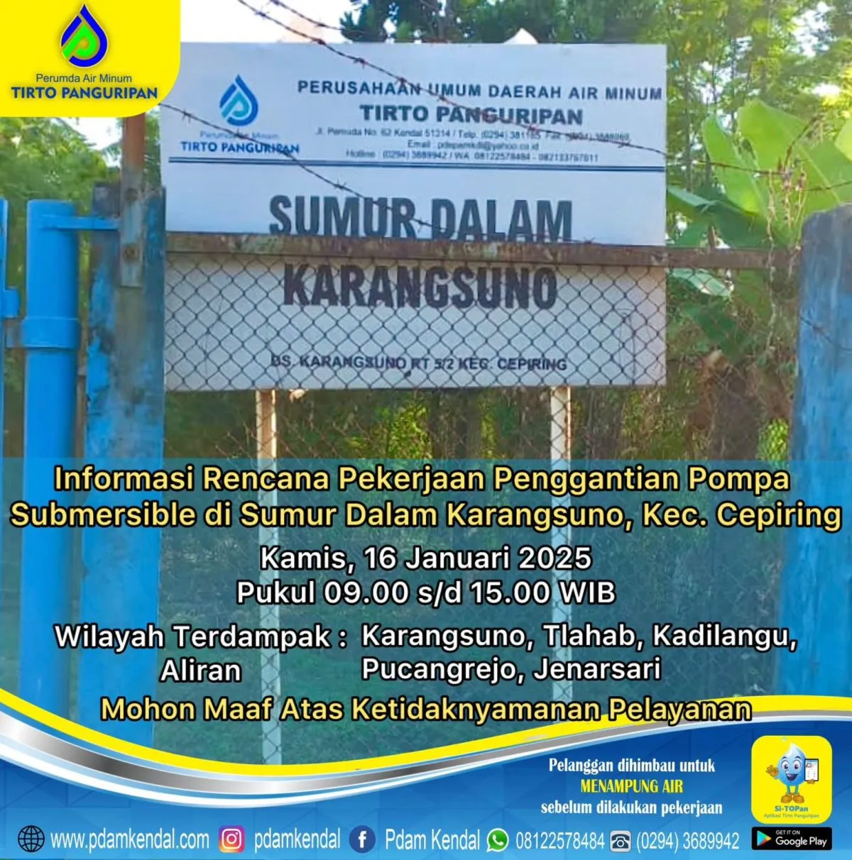 Informasi rencana pekerjaan penggantian pompa submersible di Sumur Dalam Karangsuno, Kec. Cepiring Kamis, 16 Januari 2025, pukul 09.00 s/d 15.00 WIB. Hal tersebut akan menyebabkan aliran terganggu