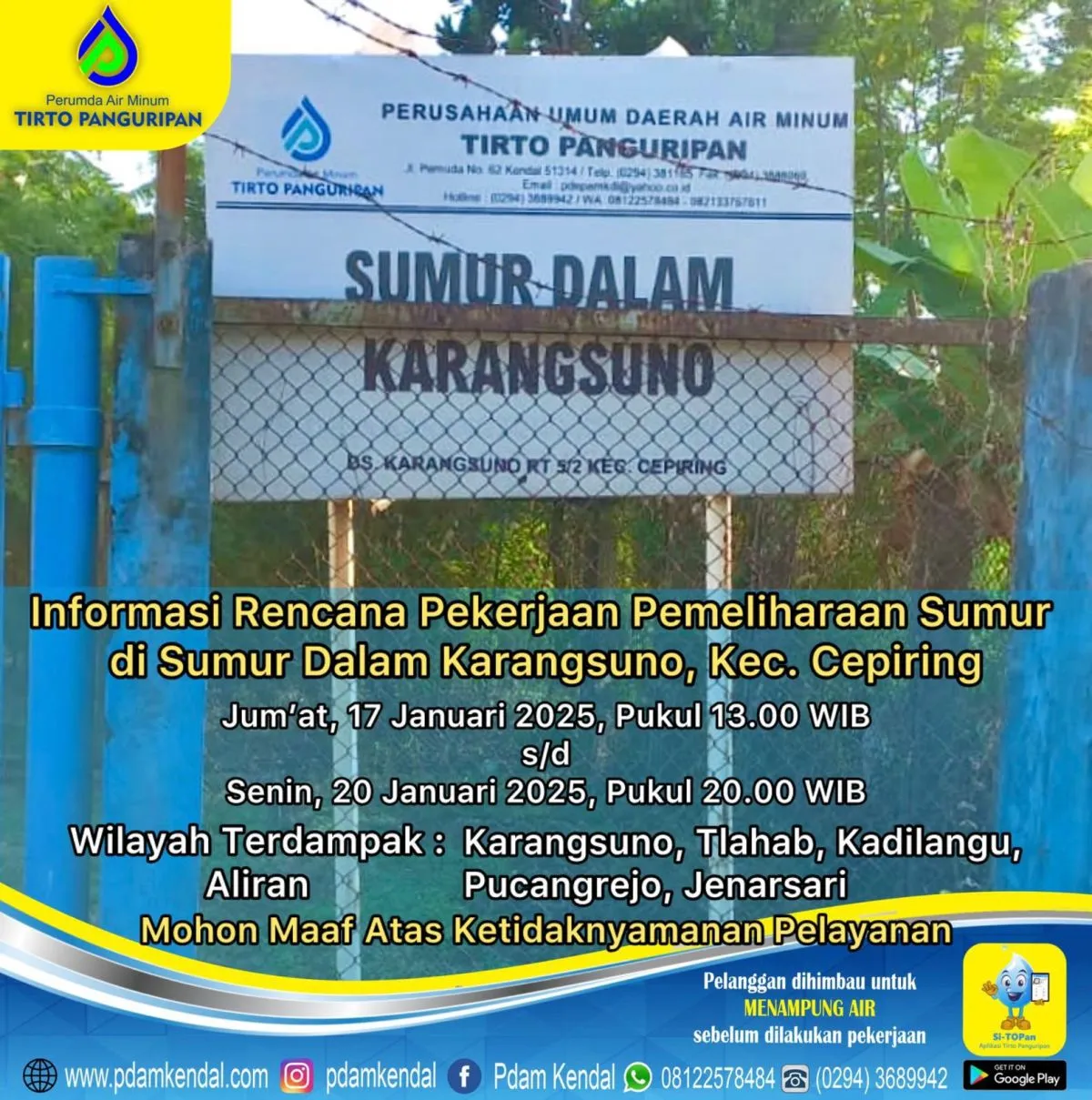 Informasi rencana pekerjaan pemeliharaan sumur di Sumur Dalam Karangsuno, Kec. Cepiring. Jumat, 17 Januari 2025, pukul 13.00 WIB s/d Senin, 20 Januari 2025, pukul 20.00 WIB Hal tersebut akan menyebabkan aliran terganggu