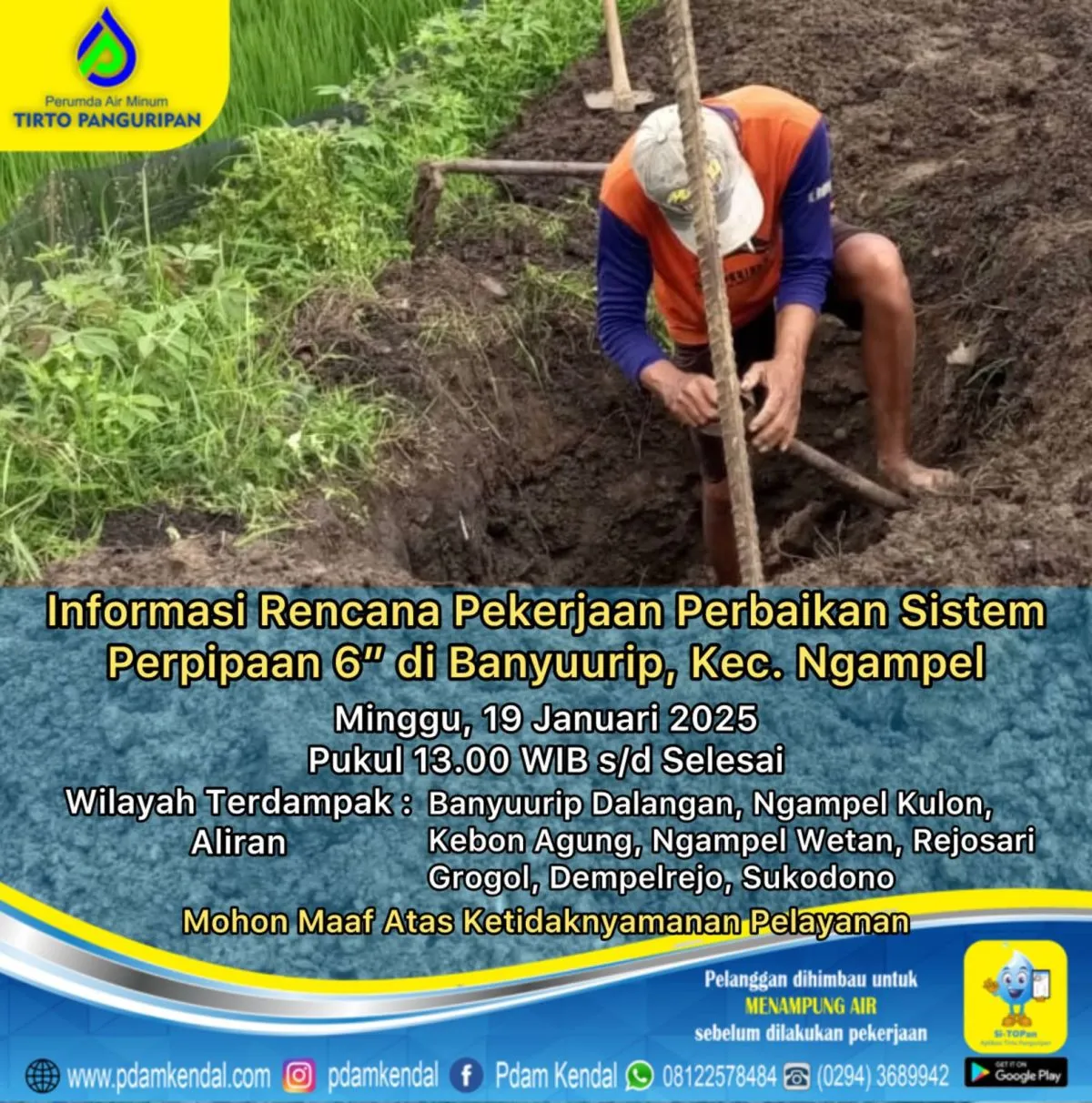 Informasi rencana pekerjaan perbaikan sistem perpipaan 6” di Banyuurip, Kec. Ngampel. Minggu, 19 Januari 2025, pukul 13.00 WIB s/d selesai. Hal tersebut akan menyebabkan aliran terganggu