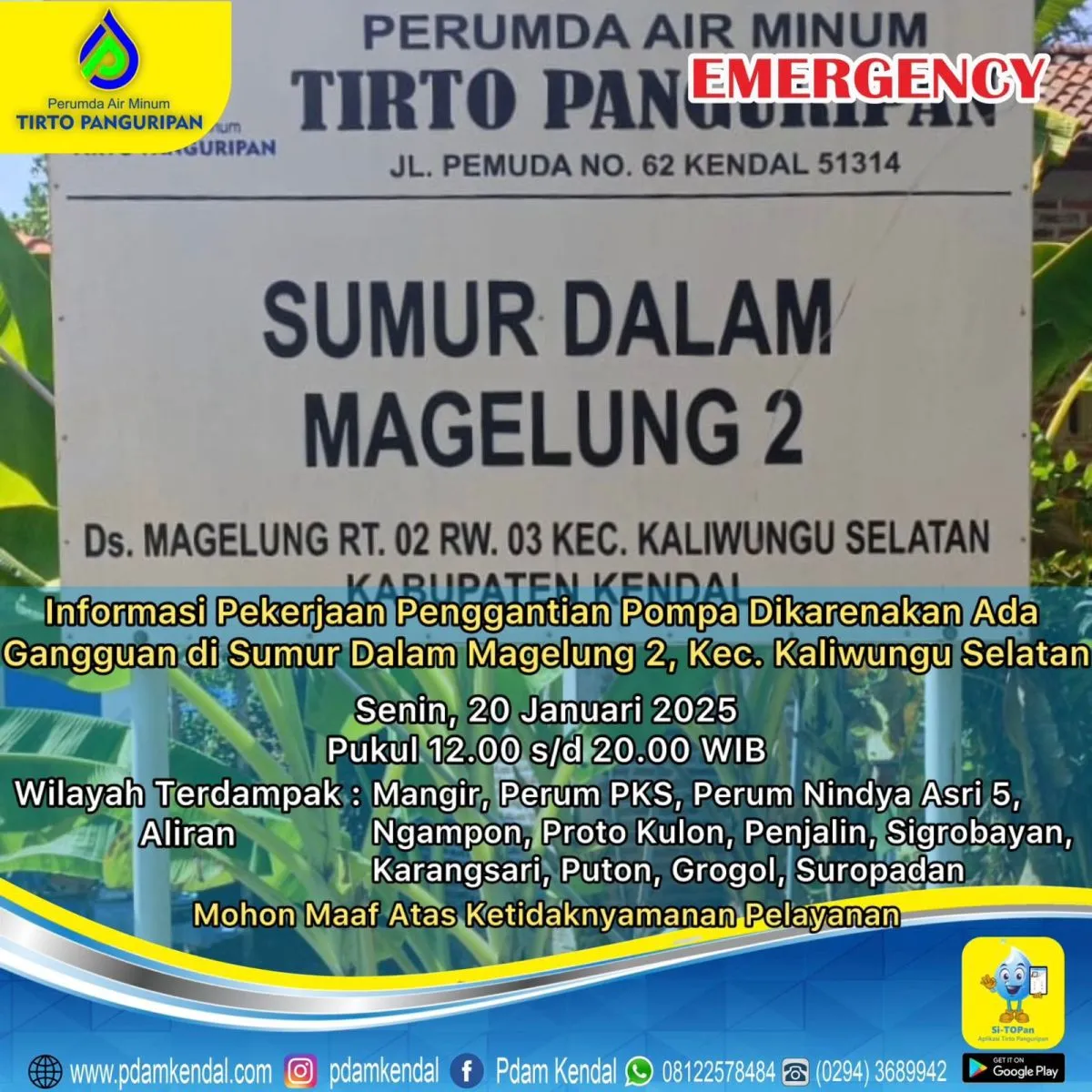 Informasi pekerjaan penggantian pompa dikarenakan ada gangguan di Sumur Dalam Magelung 2, Kec. Kaliwungu Selatan. Senin, 20 Januari 2025, pukul 12.00 s/d 20.00 WIB. Hal tersebut menyebabkan aliran terganggu