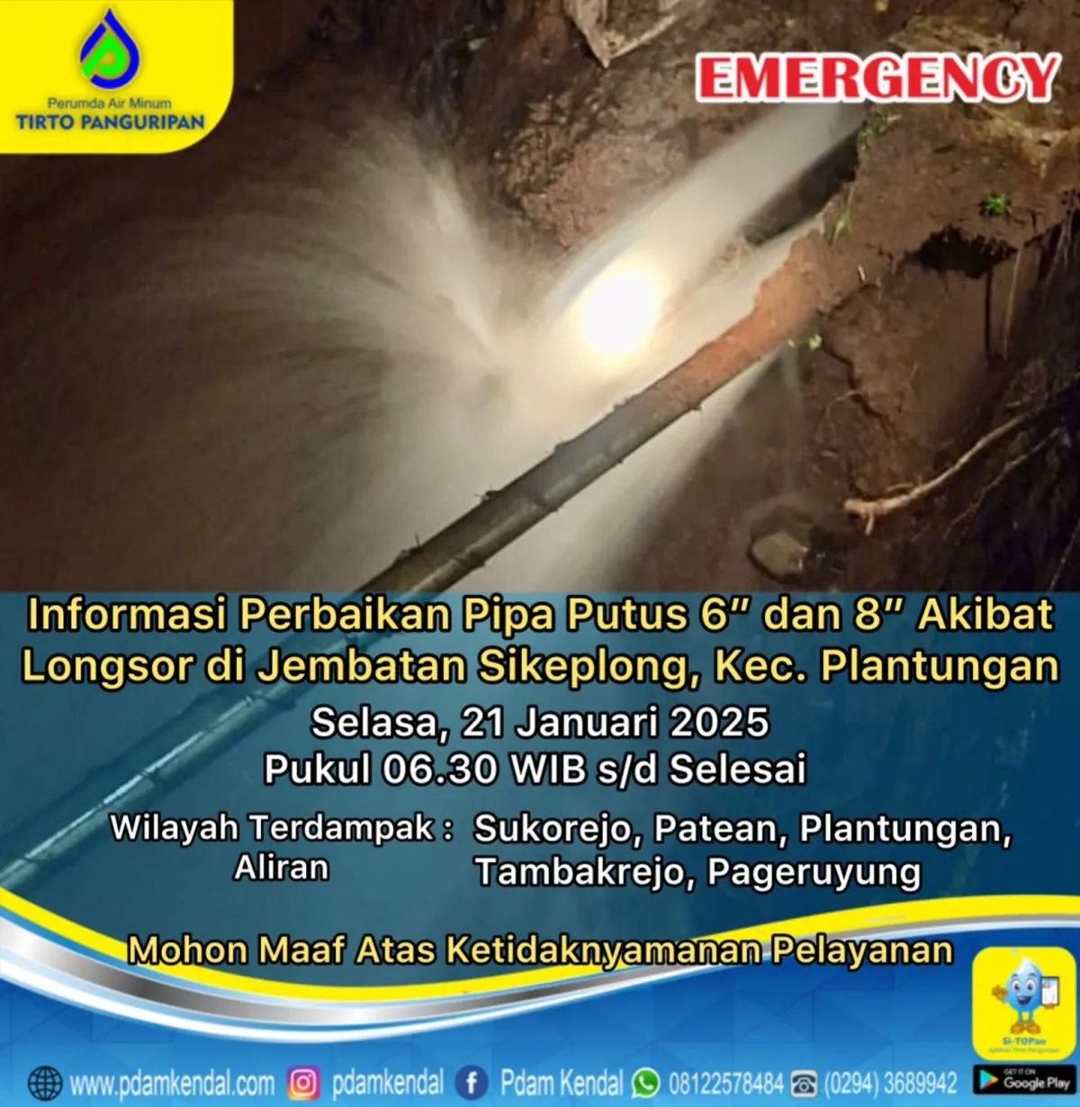 Informasi perbaikan pipa putus 6” dan 8” akibat longsor di Jembatan Sikeplong, Kec. Plantungan. Selasa, 21 Januari 2024, pukul 06.30 WIB s/d selesai. Hal tersebut menyebabkan aliran terganggu