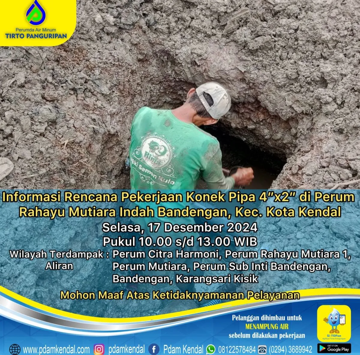 Informasi rencana konek pipa 4”x2” di Perum Rahayu Mutiara Indah Bandengan, Kec. Kota Kendal. Selasa, 17 Desember 2024, pukul 10.00 s/d 13.00 WIB Hal tersebut akan menyebabkan aliran terganggu