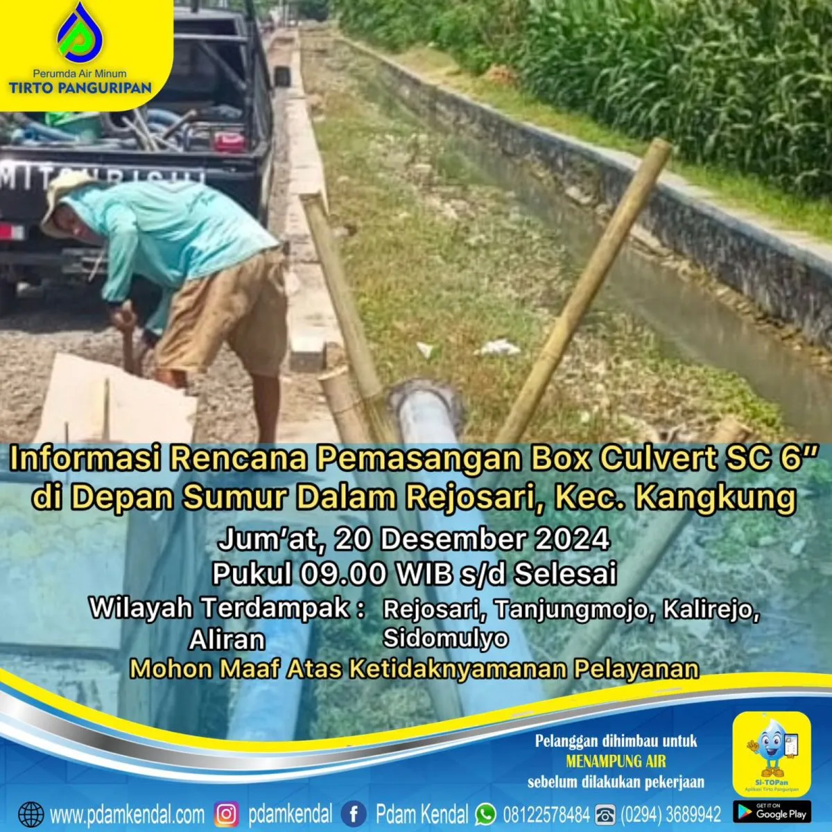 Informasi rencana pemasangan box culvert SC 6” di depan Sumur Dalam Rejosari, Kec. Kangkung. Jumat, 20 Desember 2024, pukul 09.00 WIB s/d selesai. Hal tersebut akan menyebabkan aliran terganggu