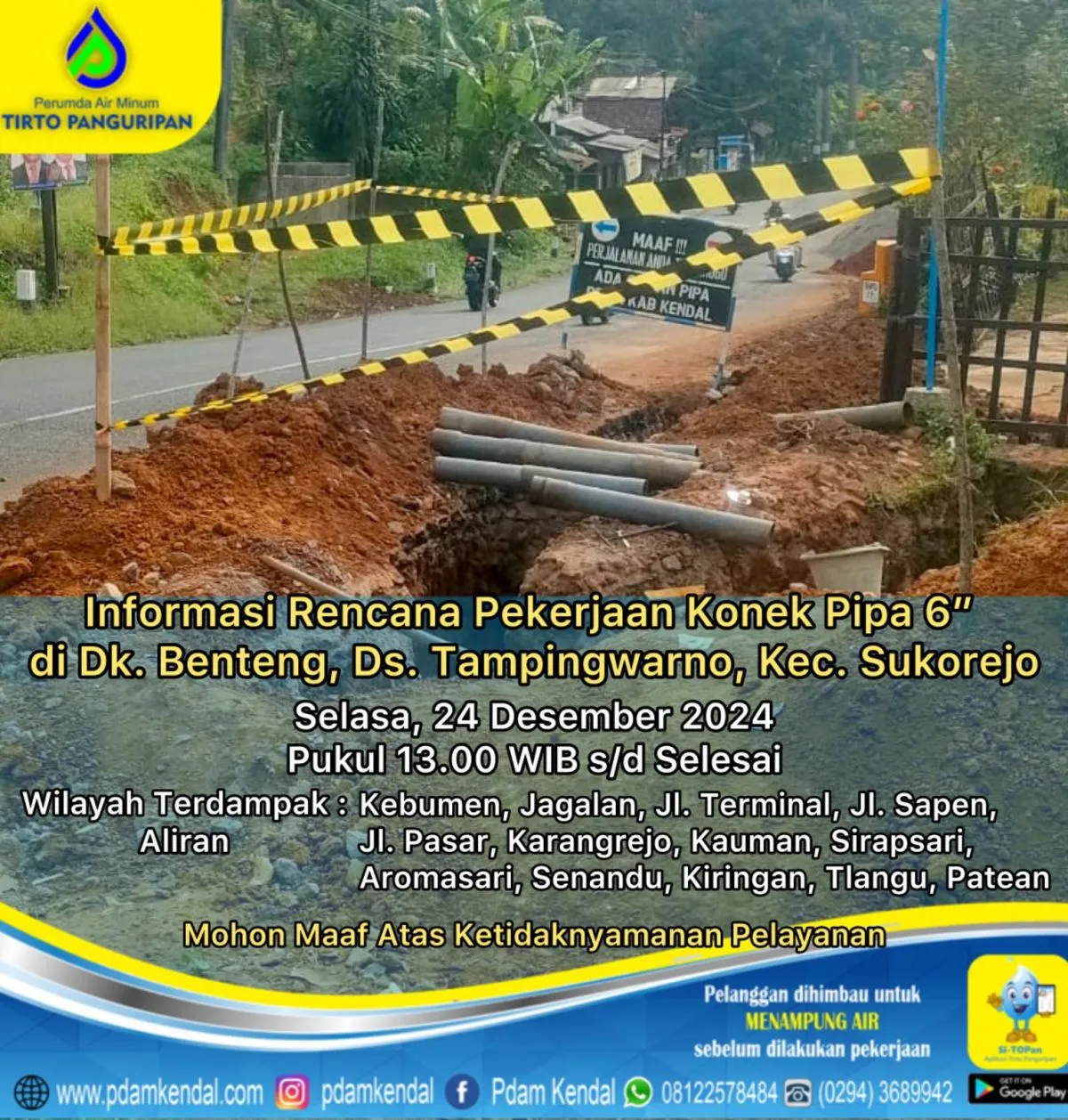 Informasi rencana pekerjaan konek pipa 6” di Dk. Benteng, Ds. Tampingwarno, Kec. Sukorejo. Selasa, 24 Desember 2024, pukul 13.00 WIB s/d selesai. Hal tersebut akan menyebabkan aliran terganggu