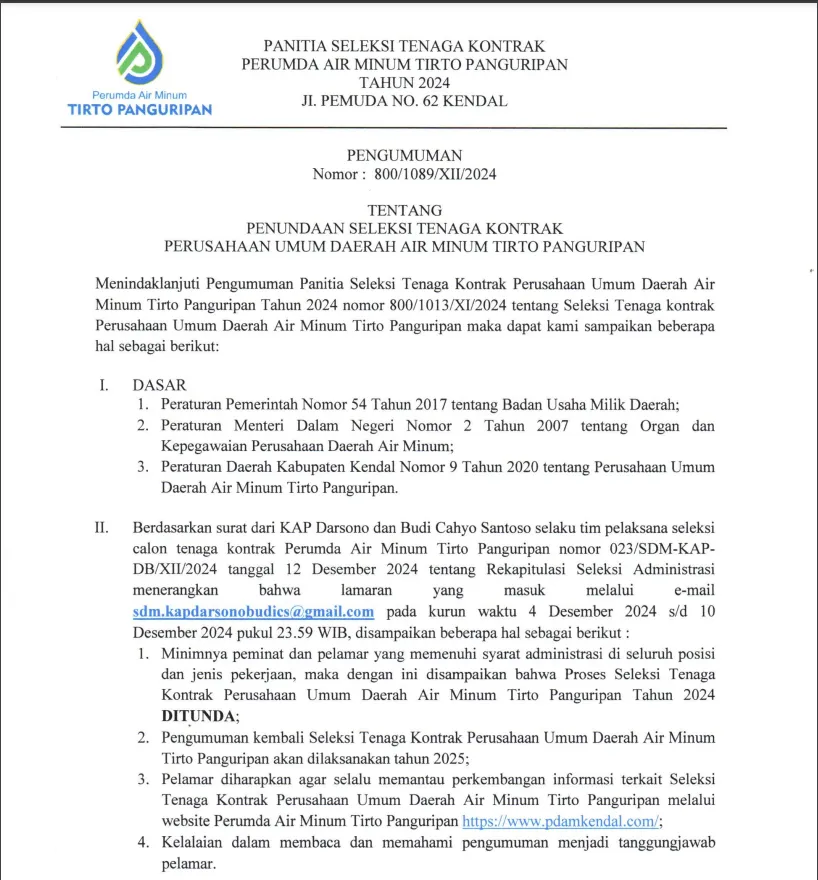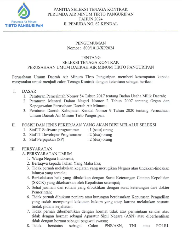 Pengumuman Seleksi Tenaga Kontrak Perumda Air Minum Tirto Panguripan