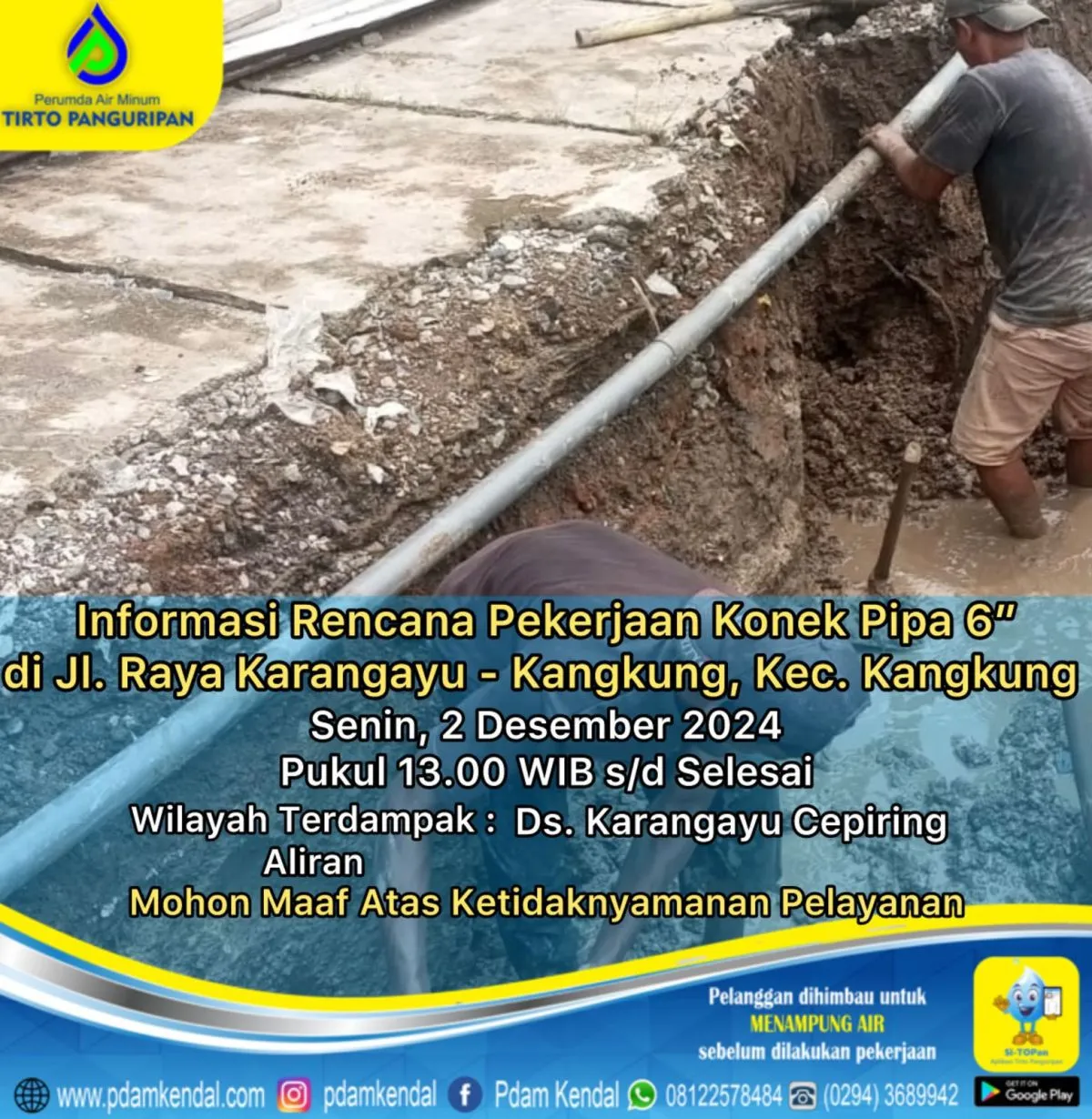 Informasi rencana pekerjaan konek pipa 6” di Jl. Raya Karangayu-Kangkung, Kec. Kangkung. Senin, 2 Desember 2024, pukul 13.00 s/d selesai. Hal tersbut akan menyebabkan aliran terganggu