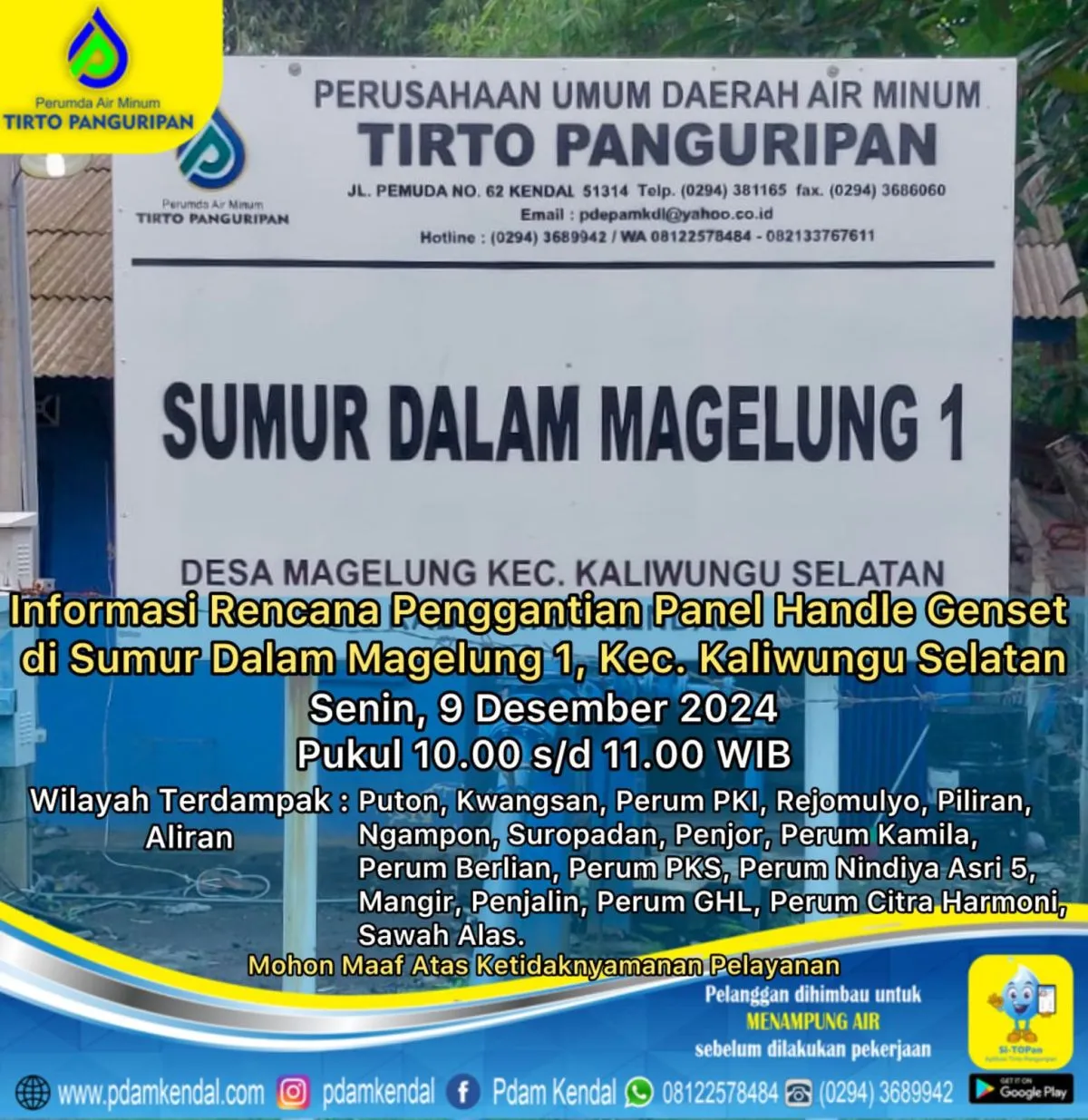Informasi rencana penggantian panel handle genset di Sumur Dalam Magelung 1, Kec. Kaliwungu Selatan. Senin, 9 Desember 2024, pukul 10.00 s/d 11.00 WIB. Hal tersebut akan mengakibatkan aliran terganggu di wilayah . . /