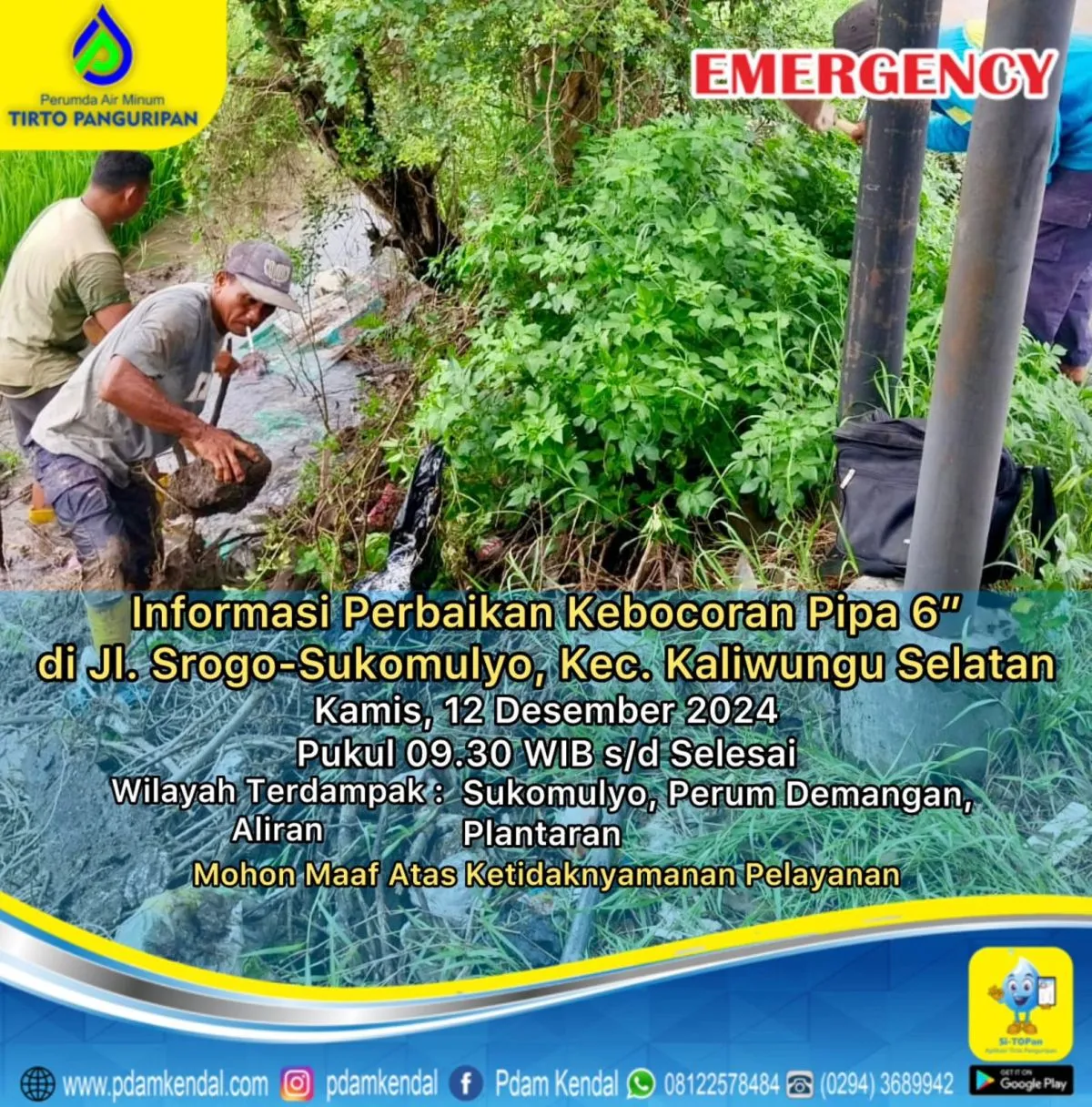 Informasi perbaikan kebocoran pipa 6” di Jl. Srogo-Sukomulyo, Kec. Kaliwungu Selatan. Kamis, 12 Desember 2024, pukul 09.30 WIB s/d selesai. Hal tersebut menyebabkan aliran terganggu