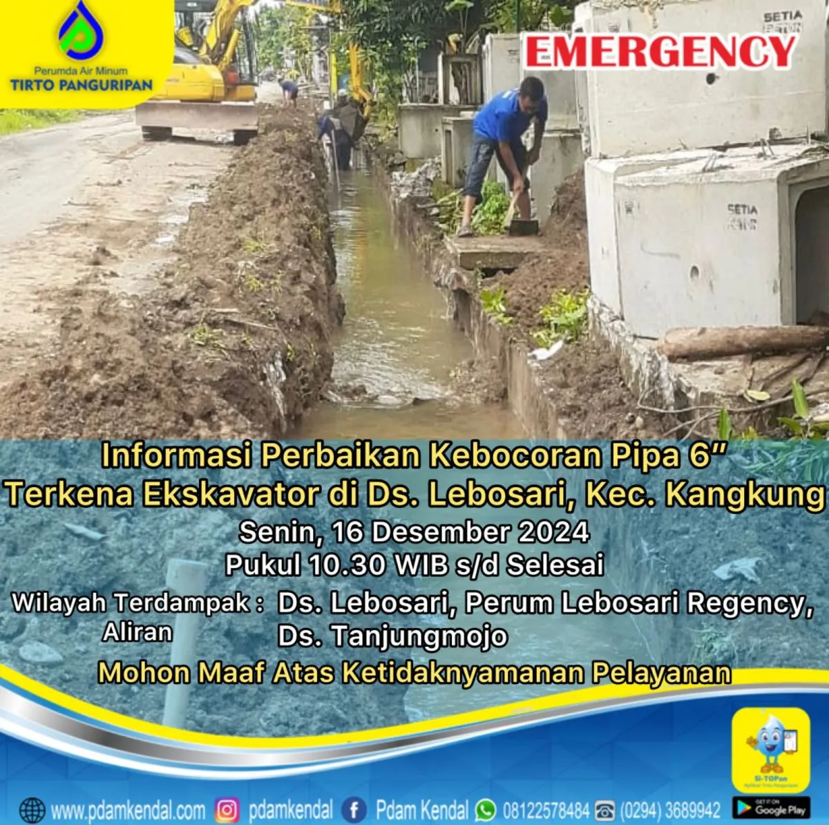 Informasi perbaikan pipa 6” terkena ekskavator di Ds. Lebosari, Kec. Kangkung. Senin, 16 Desember 2024, pukul 10.30 WIB s/d selesai. Hal tersebut menyebabkan aliran terganggu