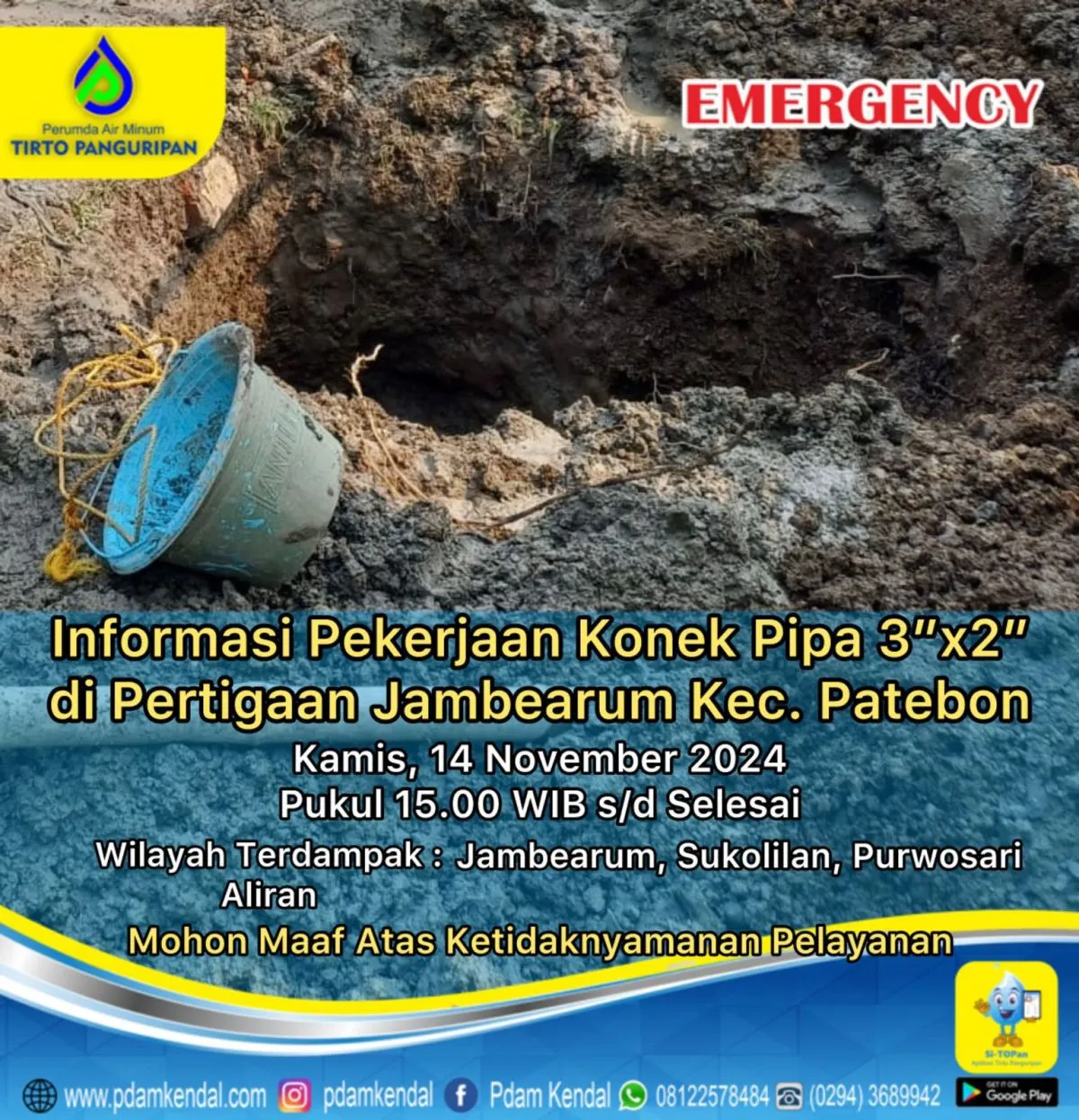 Informasi pekerjaan konek pipa 3”x2” di pertigaan Jambearum, Kec. Patebon. Kamis, 14 November 2024, pukul 15.00 WIB s/d selesai. Hal tersebut menyebabkan aliran terganggu