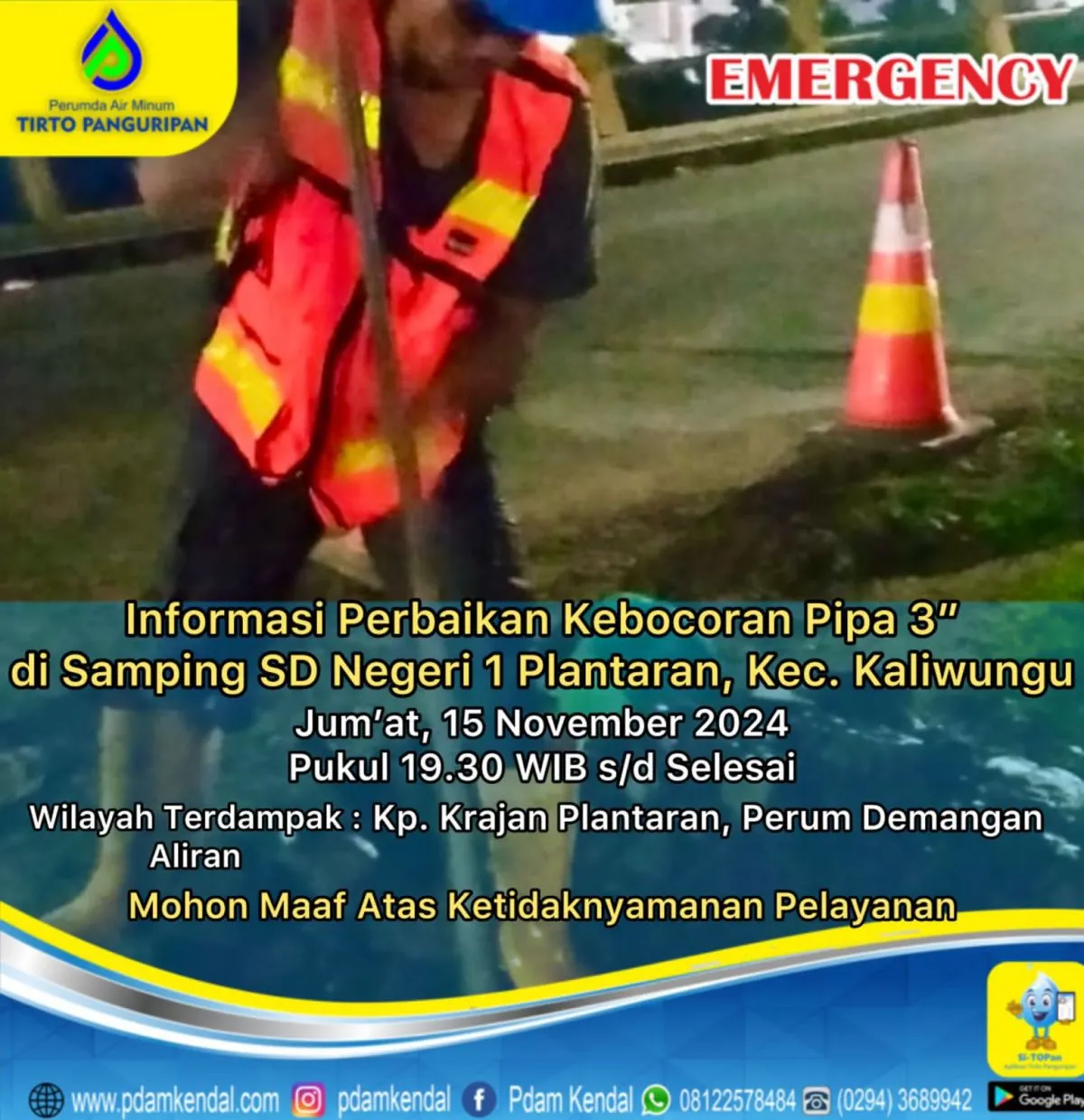 Informasi perbaikan kebocoran pipa 3” di samping SD Negeri 1 Plantaran, Kec. Kaliwungu Jumat, 15 November 2024, pukul 19.30 WIB s/d selesai. Hal tersebut menyebabkan aliran air terganggu
