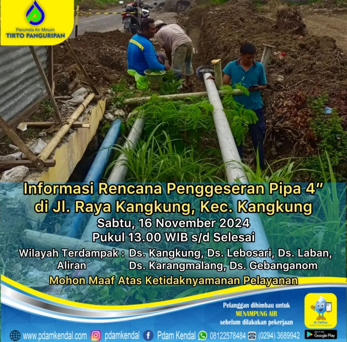 Informasi rencana pekerjaan penggeseran pipa 4” di Jl. Raya Kangkung, Kec. Kangkung. Sabtu, 16 November 2024, pukul 13.00 WIB s/d selesai. Hal tersebut akan menyebabkan aliran terganggu