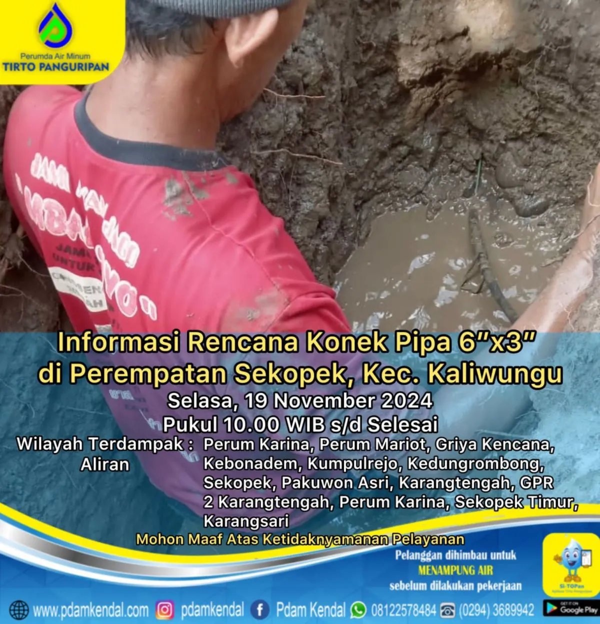 Informasi rencana konek pipa 6”x3” di Perempatan Sekopek, Kec. Kaliwungu. Selasa, 19 November 2024, pukul 10.00 WIB s/d selesai. Hal tersebut akan menyebabkan aliran terganggu