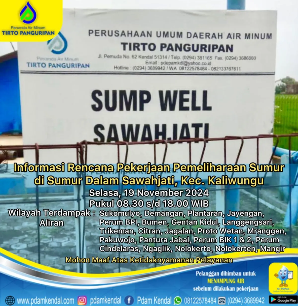 Informasi rencana pekerjaan pemeliharaan sumur di Sumur Dalam Sawahjati, Kec. Kaliwungu. Selasa, 19 November 2024, pukul 08.30 s/d 18.00 WIB Hal tersebut akan menyebabkan aliran terganggu