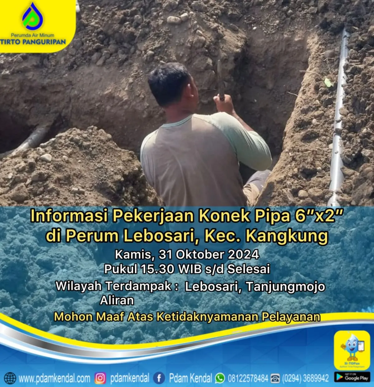 Informasi pekerjaan konek pipa 6”x2” di Perum Lebosari, Kec. Kangkung. Kamis, 31 Oktober 2024, pukul 15.30 WIB s/d selesai. Hal tersebut menyebabkan aliran terganggu