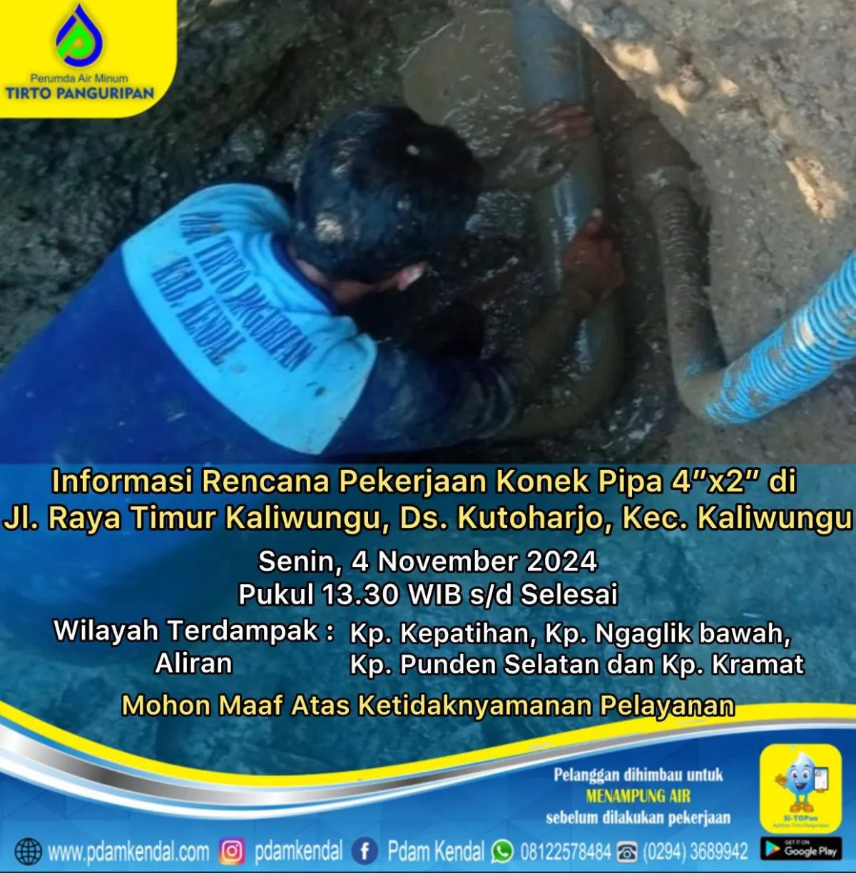 Informasi rencana pekerjaan konek pipa 4”x2” di Jl. Raya Timur Kaliwungu, Ds. Kutoharjo, Kec. Kaliwungu. Senin, 4 November 2024, pukul 13.30 WIB s/d selesai. Hal tersebut akan menyebabkan aliran terganggu