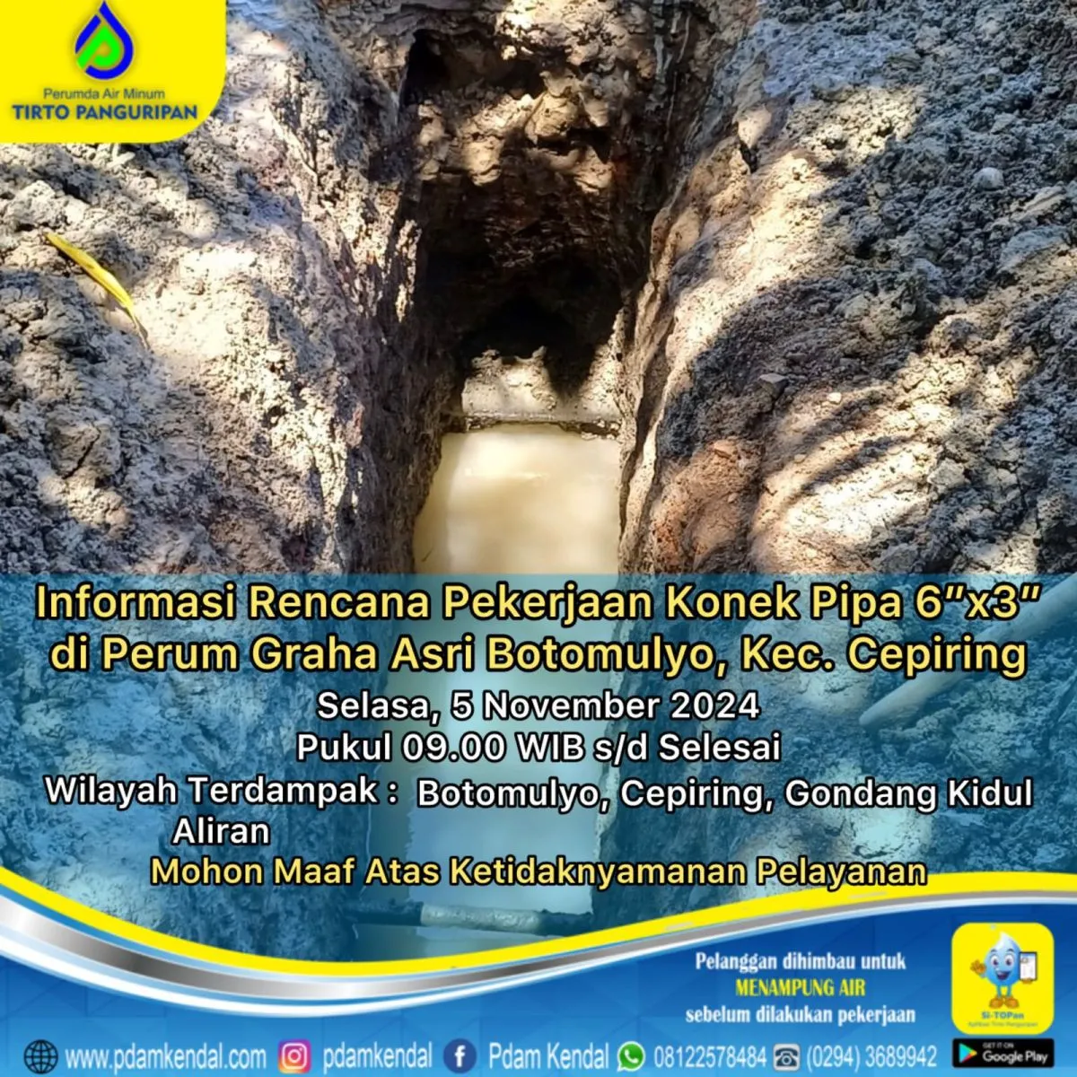 Informasi rencana pekerjaan konek pipa 6”x3” di Perum Graha Asri Botomulyo, Kec. Cepiring. Selasa, 5 November 2024, pukul 09.00 WIB s/d selesai. Hal tersebut akan menyebabkan aliran terganggu