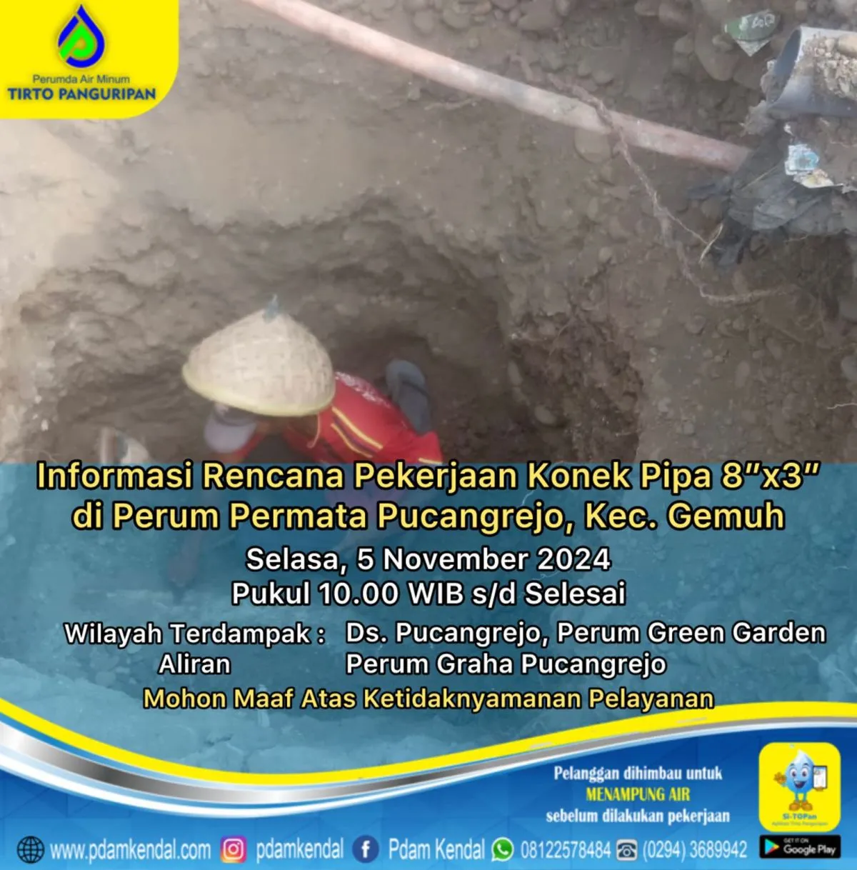 Informasi rencana pekerjaan konek pipa 8”x3” di Perum Permata Pucangrejo, Kec. Gemuh. Selasa, 5 November 2024, pukul 10.00 WIB s/d selesai. Hal tersebut akan menyebabkan aliran terganggu