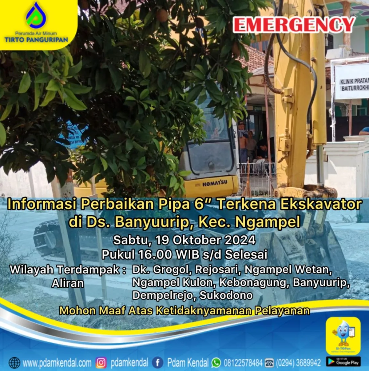 Informasi perbaikan pipa 6” terkena ekskavator di Ds. Banyuurip, Kec. Ngampel. Sabtu, 19 Oktober 2024, pukul 15.30 WIB s/d selesai. Hal tersebut menyebabkan aliran terganggu