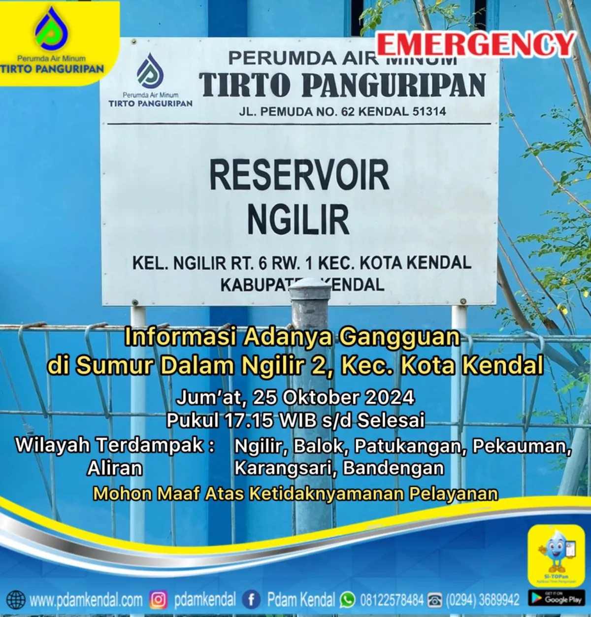 Informasi adanya gangguan di Sumur Dalam Ngilir 2, Kec. Kota Kendal. Jum’at, 25 Oktober 2024, pukul 17.15 WIB s/d selesai. Hal tersebut menyebabkan aliran terganggu