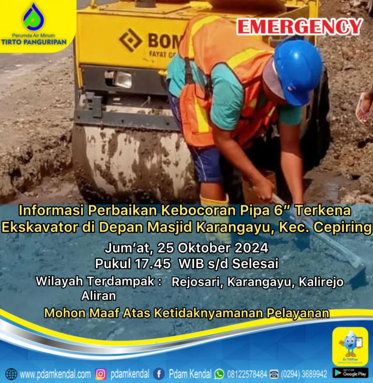 Informasi perbaikan kebocoran pipa 6” terkena ekskavator di depan Masjid Karangayu, Kec. Cepiring. Jum’at, 25 Oktober 2024, pukul 17.45 WIB s/d selesai. Hal tersebut menyebabkan aliran terganggu