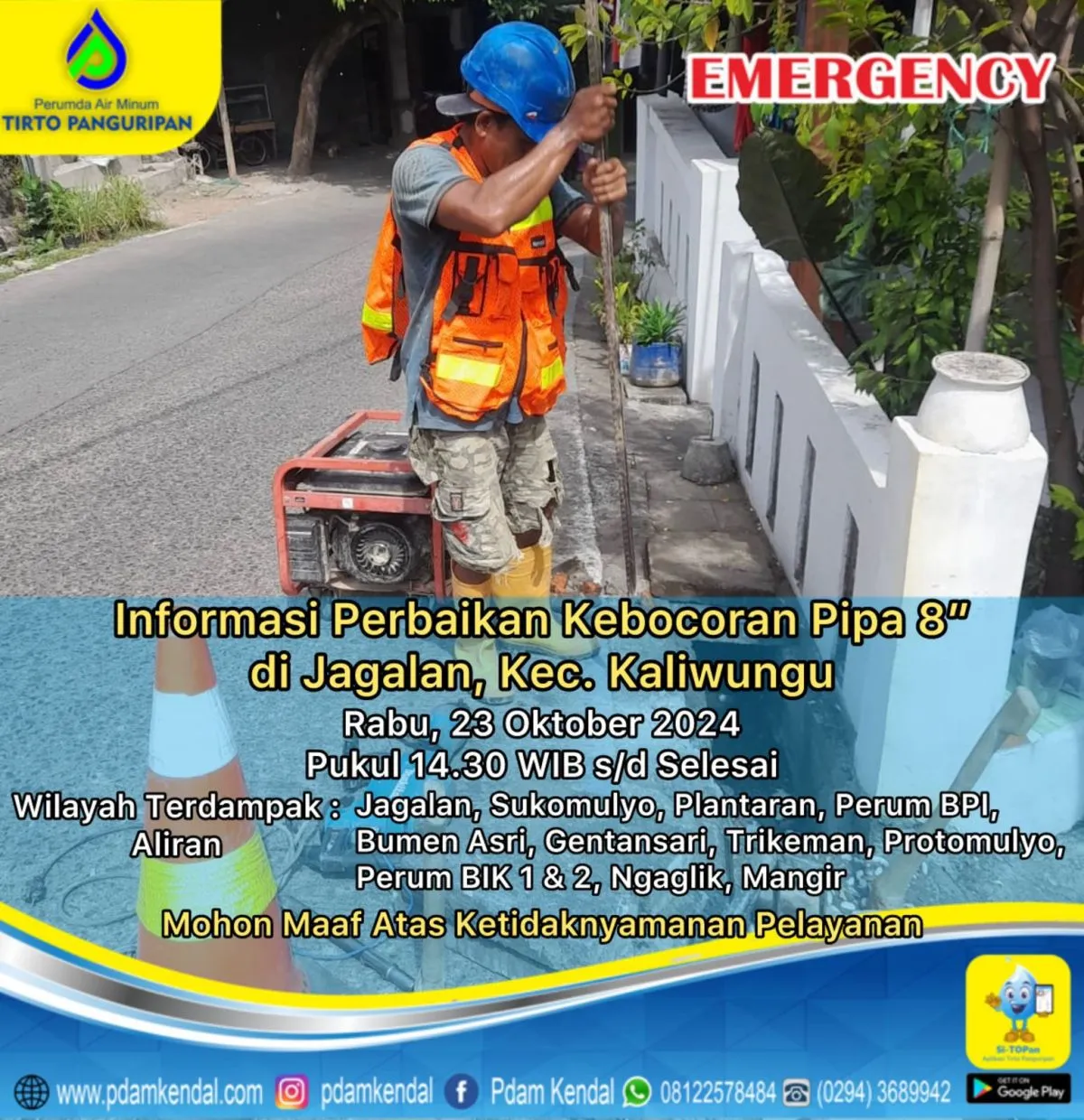 Informasi perbaikan kebocoran pipa 8” di Jagalan, Kec. Kaliwungu. Rabu, 23 Oktober 2024, pukul 14.30 WIB s/d selesai. Hal tersebut menyebabkan aliran terganggu