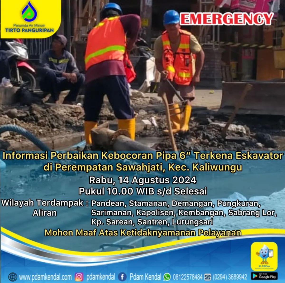 Informasi perbaikan kebocoran pipa 6” terkena eskavator di Perempatan Sawahjati, Kec. Kaliwungu. Rabu, 14 Agustus 2024, pukul 10.00 WIB s/d selesai. Hal tersebut menyebabkan aliran terganggu