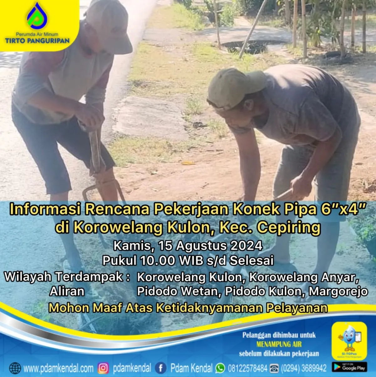 Informasi rencana pekerjaan konek pipa 6”x4” di Korowelang Kulon, Kec. Cepiring. Kamis, 15 Agustus 2024, pukul 10.00 WIB s/d selesai. Hal tersebut akan menyebabkan aliran terganggu