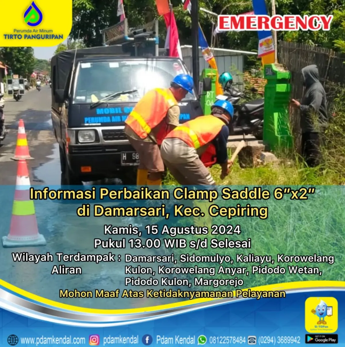 Informasi perbaikan kebocoran clamp saddle 6”x2” di Damarsari, Kec. Cepiring. Kamis, 15 Agustus 2024, pukul 13.00 WIB s/d selesai. Hal tersebut menyebabkan aliran terganggu