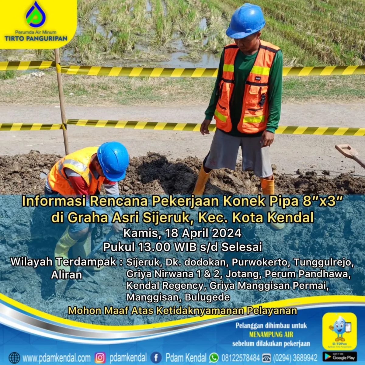 Informasi rencana pekerjaan konek pipa 8”x3” di Graha Asri Sijeruk, Kec. Kota Kendal. Kamis, 18 April 2024, pukul 13.00 WIB s/d selesai. Hal tersebut akan menyebabkan aliran terganggu