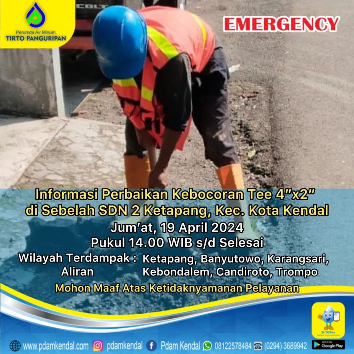 Informasi perbaikan kebocoran tee 4”x2” di sebelah SDN 2 Ketapang, Kec. Kota Kendal. Jumat, 19 April 2024, pukul 14.00 WIB s/d selesai. Hal tersebut akan menyebabkan aliran terganggu