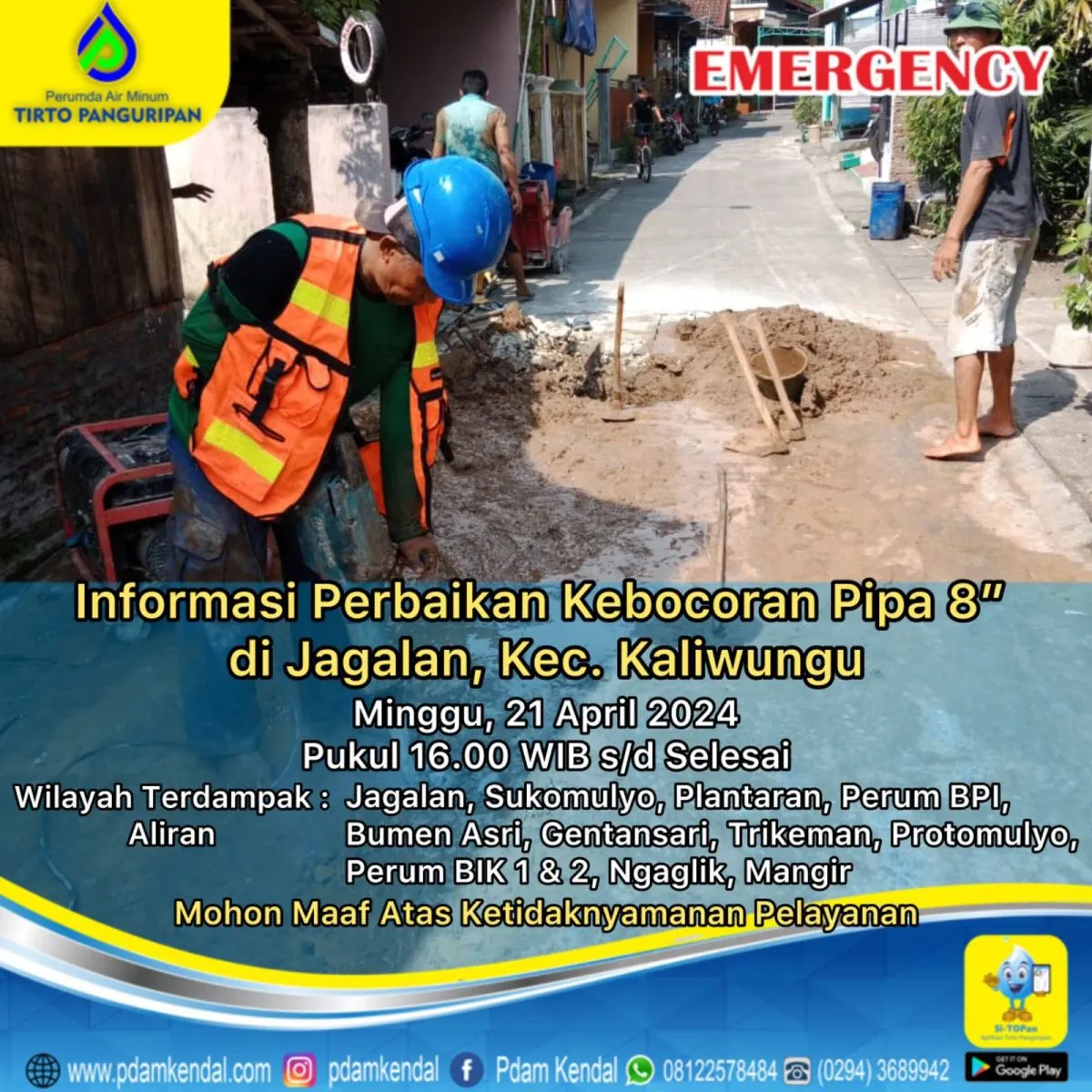 Informasi perbaikan kebocoran pipa 8” di Jagalan, Kec. Kaliwungu. Minggu, 21 April 2024, pukul 16.00 WIB s/d selesai. Hal tersebut menyebabkan aliran terganggu