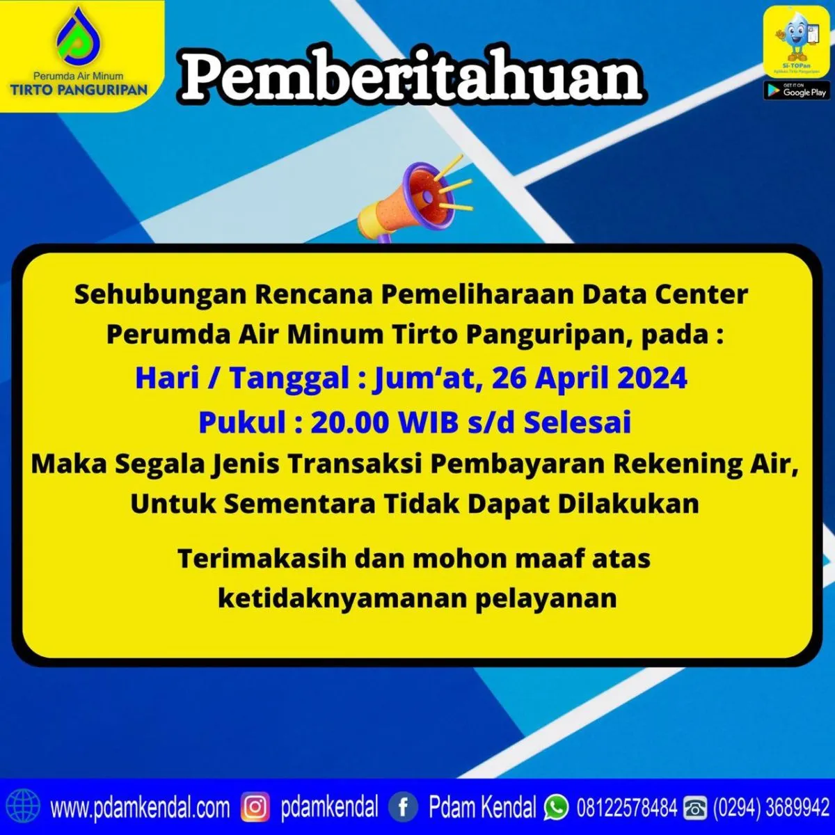 Sehubungan rencana pemeliharaan data center Perumda Air Minum Tirto Panguripan, pada : Hari / Tanggal : Jum’at, 26 April 2024 Pukul : 20.00 WIB s/d selesai. Maka segala jenis transaksi pembayaran rekening air, untuk sementara tidak dapat dilakukan. Ter