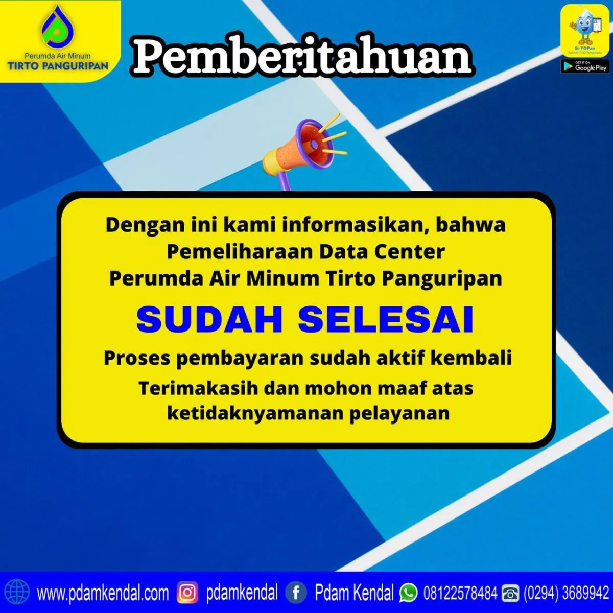 Dengan ini kami menginformasikan, bahwa pemeliharaan data center Perumda Air Minum Tirto Panguripan. SUDAH SELESAI Proses pembayaran sudah aktif kembali
