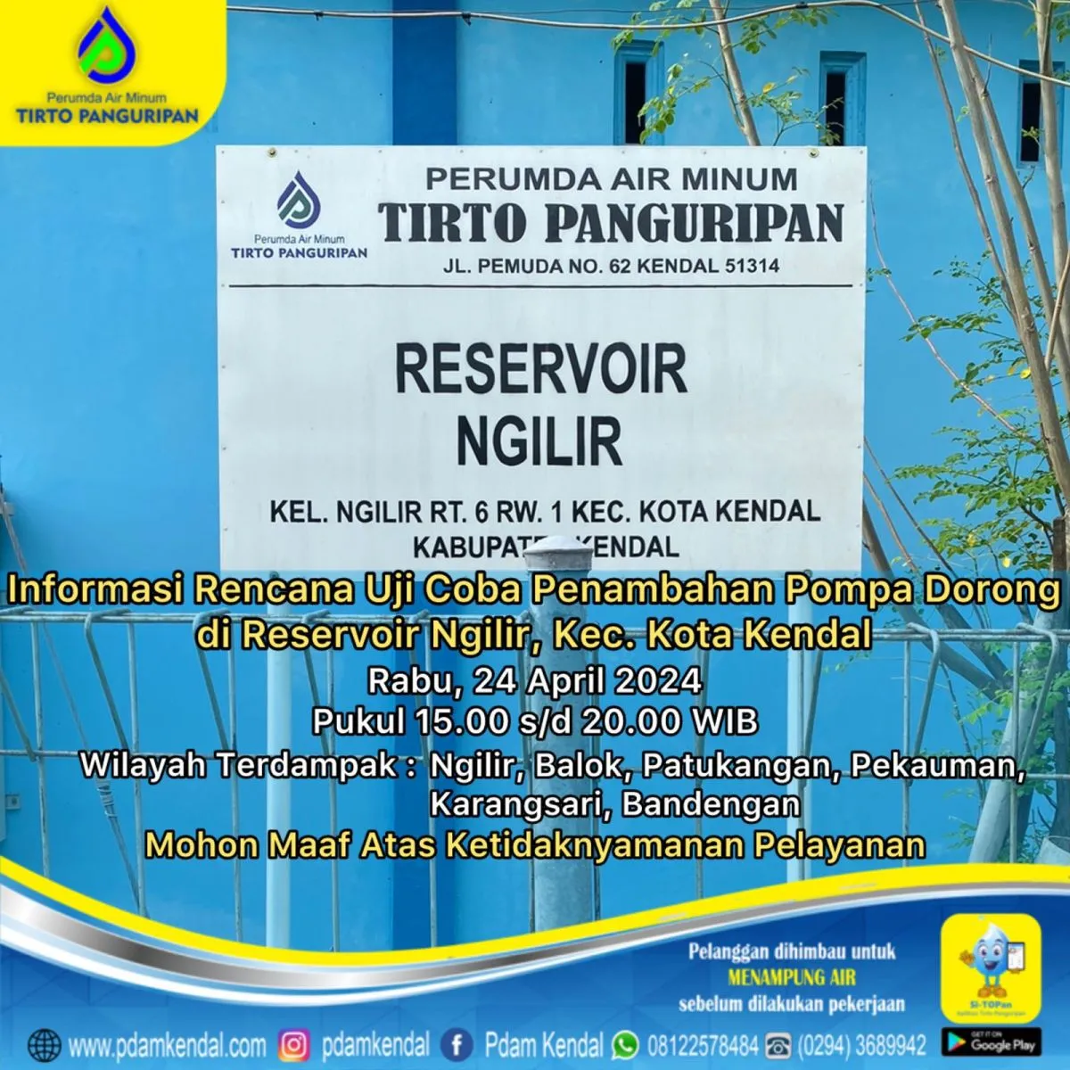 Informasi rencana uji coba penambahan pompa dorong di Reservoir Ngilir, Kec. Kota Kendal. Rabu, 24 April 2024, pukul 15.00 s/d 20.00 WIB. Hal tersebut menyebabkan aliran terganggu
