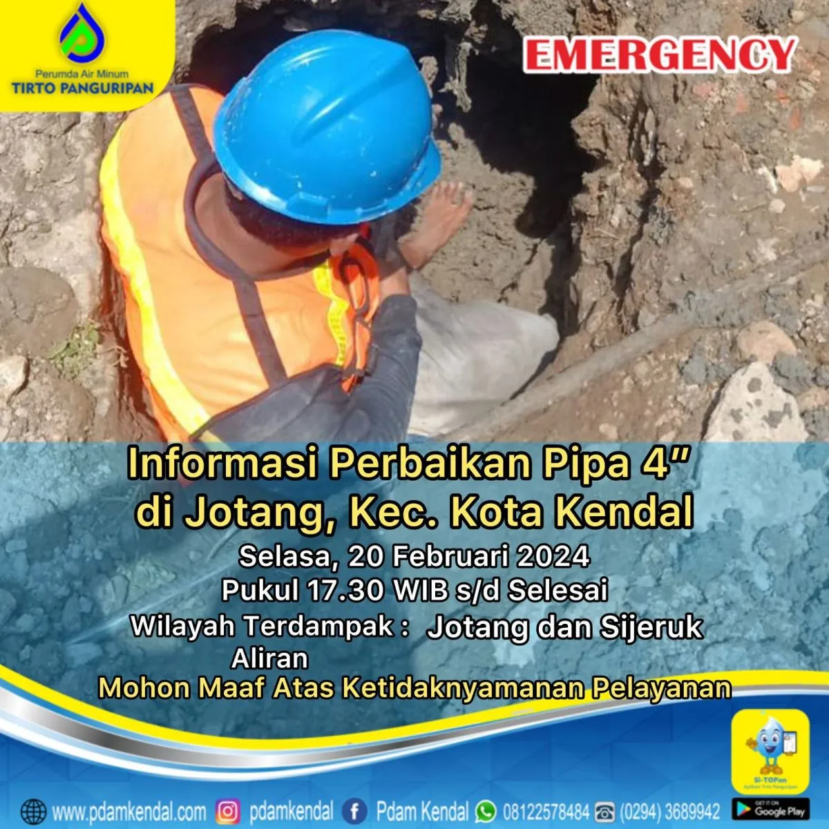 Informasi perbaikan pipa 4” di Jotang, Kec. Kota Kendal. Selasa, 20 Februari 2024, pukul 17.30 WIB s/d selesai. Hal tersebut akan menyebabkan aliran terganggu