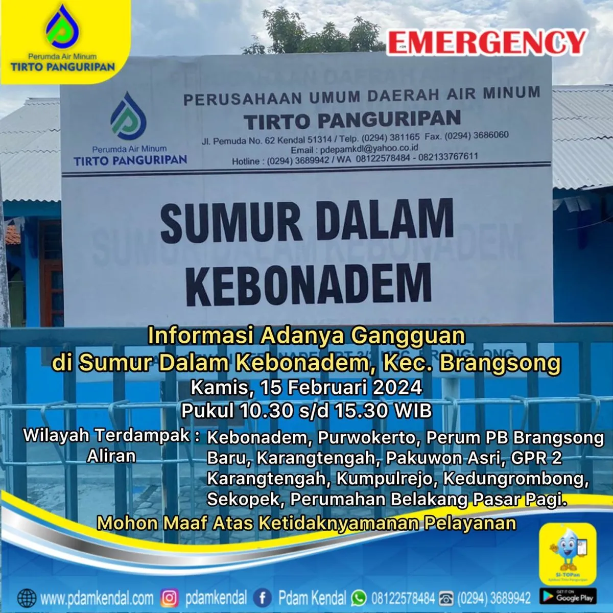 Informasi adanya gangguan di Sumur Dalam Kebonadem, Kec. Brangsong. Kamis, 15 Februari 2024, pukul 10.30 s/d 15.30 WIB. Hal tersebut menyebabkan aliran terganggu
