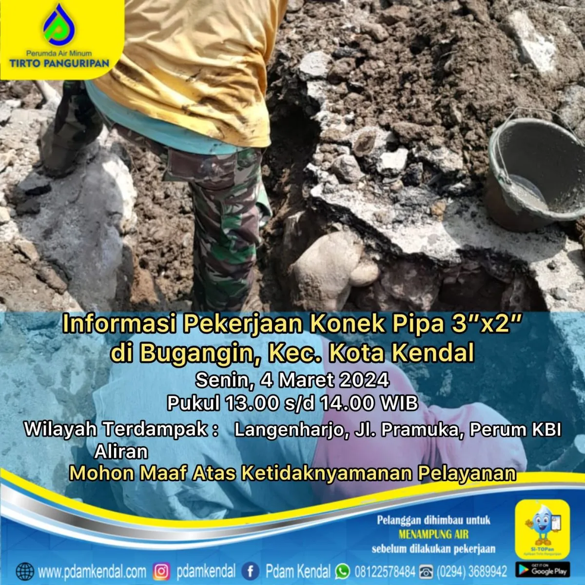 Informasi pekerjaan konek pipa 3”x2” di Bugangin, Kec. Kota Kendal. Senin, 4 Maret 2024, pukul 13.00 s/d 14.00 WIB. Hal tersebut akan menyebabkan aliran terganggu