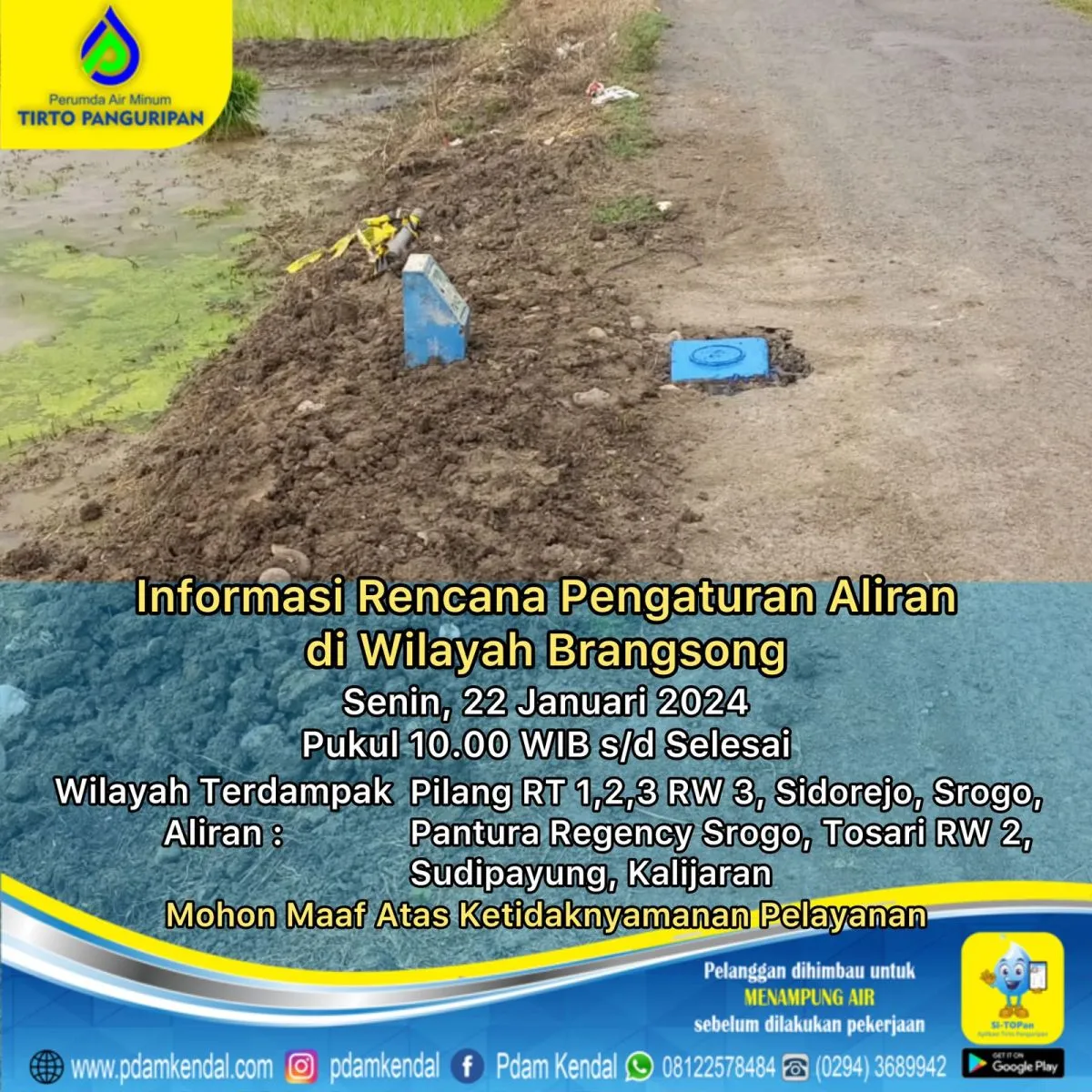 Informasi rencana pengaturan aliran di wilayah Brangsong. Senin, 22 Januari 2024, pukul 10.00 WIB s/d selesai. Hal tersebut akan menyebabkan aliran terganggu