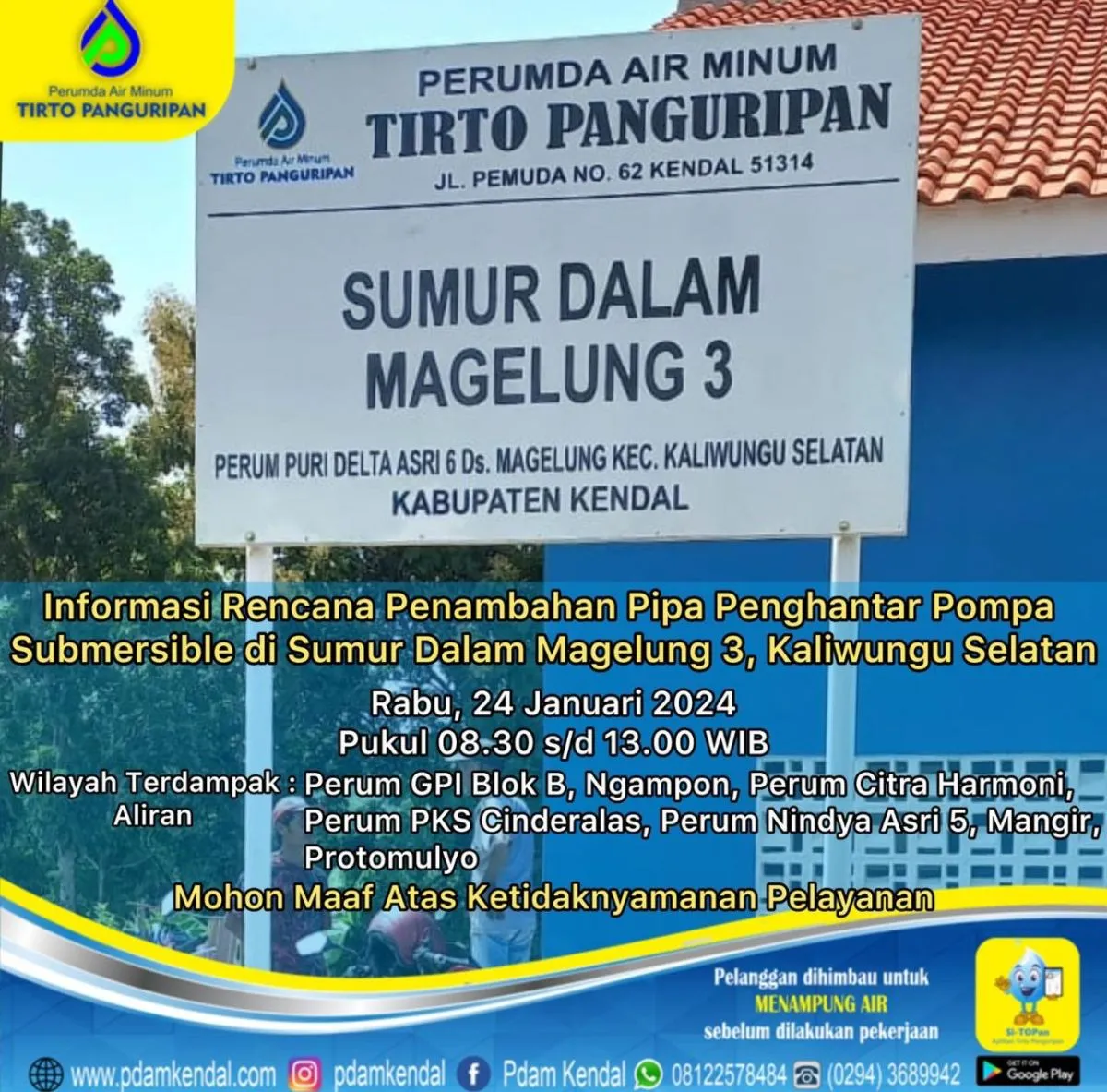 Informasi rencana pekerjaan penambahan pipa penghantar pompa submersible di Sumur Dalam Magelung 3, Kec. Kaliwungu Selatan. Senin, 29 Januari 2024, pukul 09.00 s/d 15.00 WIB. Hal tersebut akan menyebabkan aliran terganggu