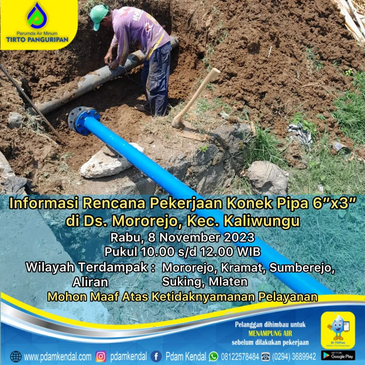 Informasi rencana pekerjaan konek pipa 6"x3" di Ds. Mororejo, Kec. Kaliwungu. Rabu, 8 November 2023, pukul 10.00 s/d 12.00 WIB. Hal tersebut akan menyebabkan aliran terganggu