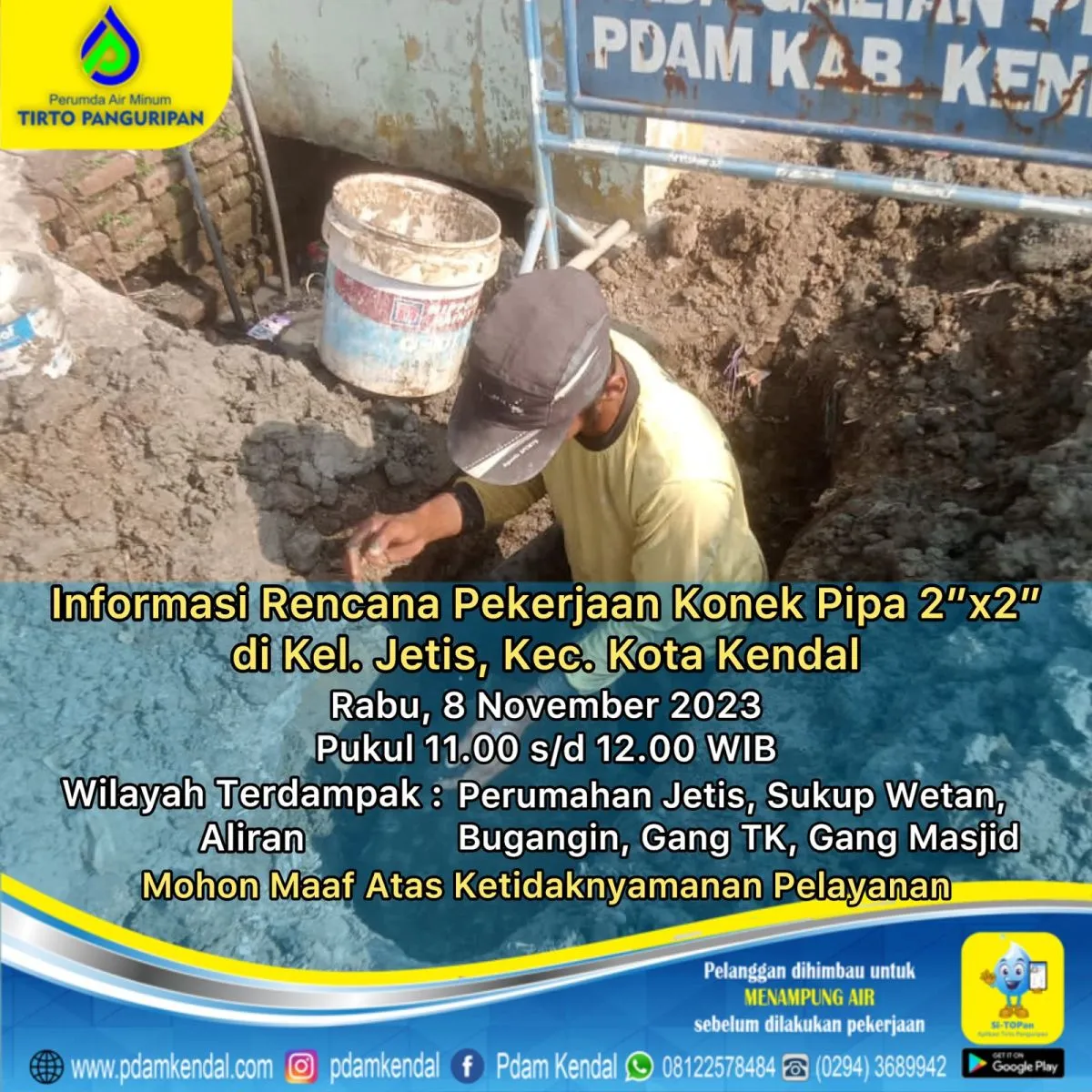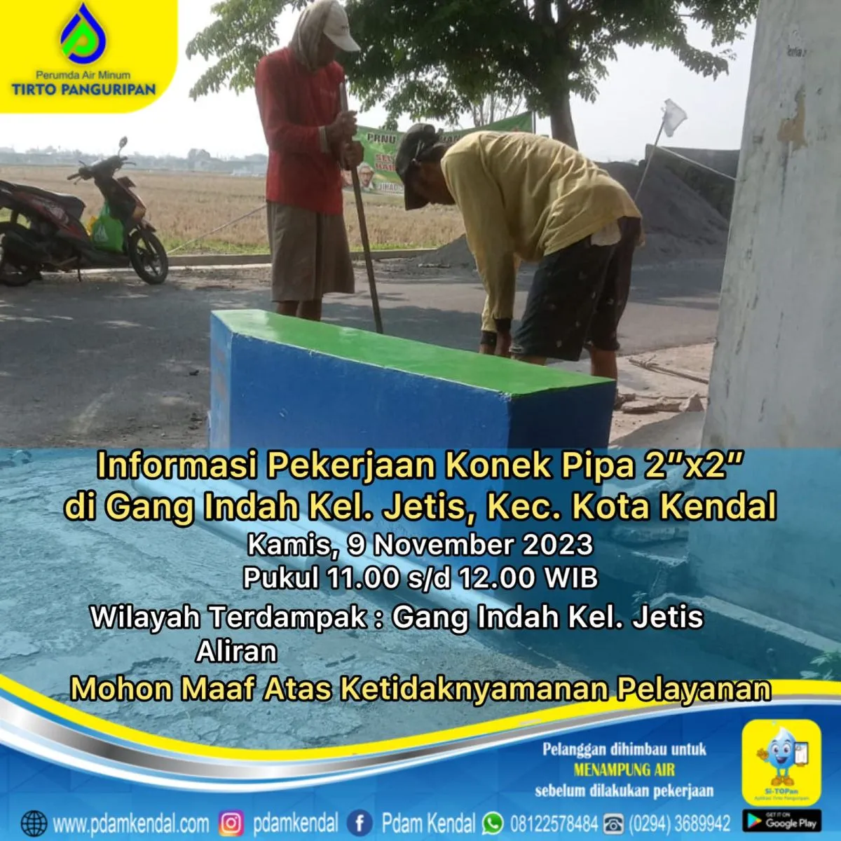 Informasi pekerjaan konek pipa 2"x2" di Gang Indah Kel. Jetis, Kec. Kota Kendal. Kamis, 9 November 2023, pukul 11.00 s/d 12.00 WIB. Hal tersebut akan menyebabkan aliran terganggu