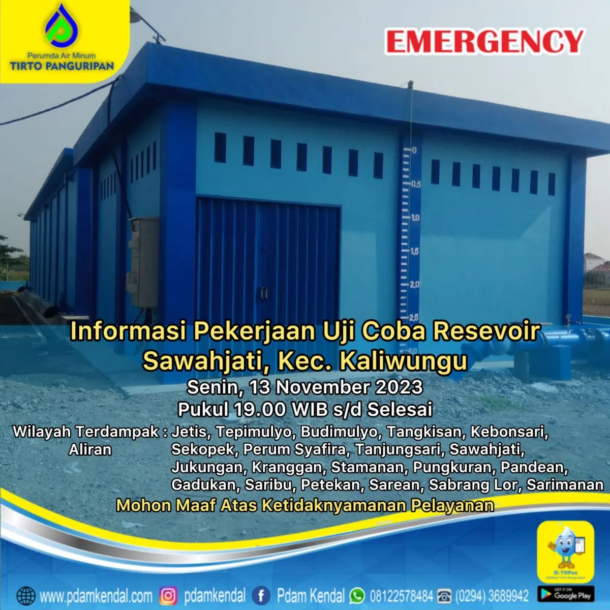 Informasi pekerjaan uji coba Reservoir Sawahjati, Kec. Kaliwungu. Senin, 13 November 2023, pukul 19.00 WIB s/d selesai. Hal tersebut akan menyebabkan aliran terganggu