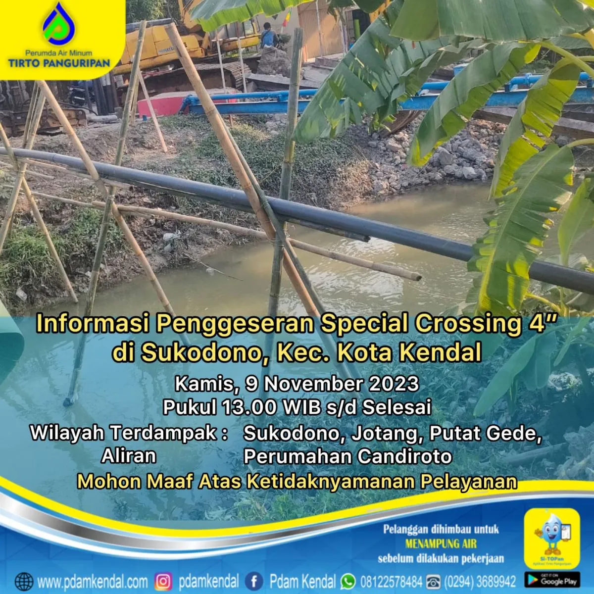 Informasi penggeseran Special Crossing 4" di Sukodono, Kec. Kota Kendal. Kamis, 9 November 2023, pukul 13.00 WIB s/d selesai. Hal tersebut akan menyebabkan aliran terganggu
