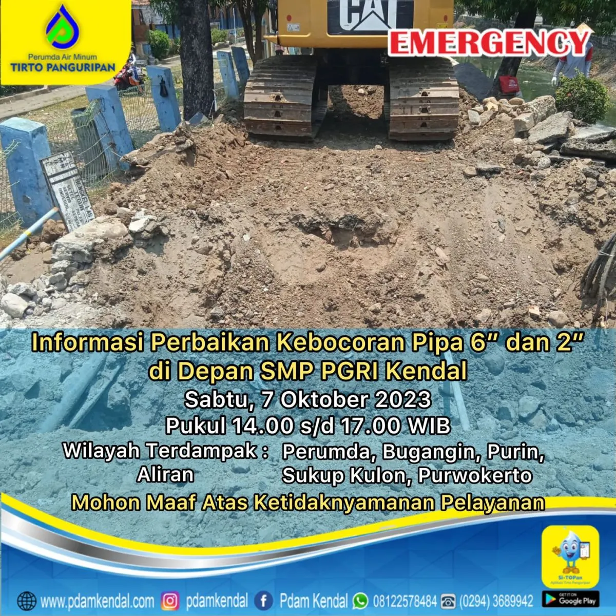 Informasi perbaikan kebocoran pipa 6" dan 2" di depan SMP PGRI Kendal. Sabtu, 7 Oktober 2023, pukul 14.00 s/d 17.00 WIB. Hal tersebut akan mengakibatkan aliran terganggu