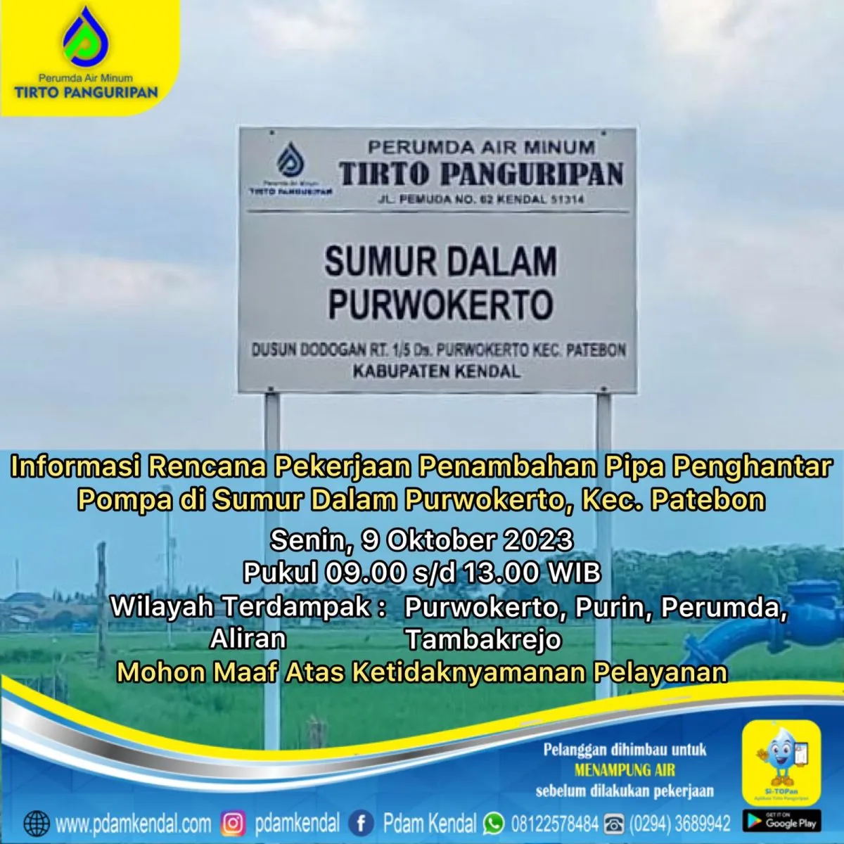 Informasi rencana pekerjaan penambahan pipa penghantar pompa di Sumur Dalam Purwokerto, Kec. Patebon. Senin, 9 Oktober 2023, pukul 09.00 s/d 13.00 WIB. Hal tersebut akan menyebabkan aliran terganggu