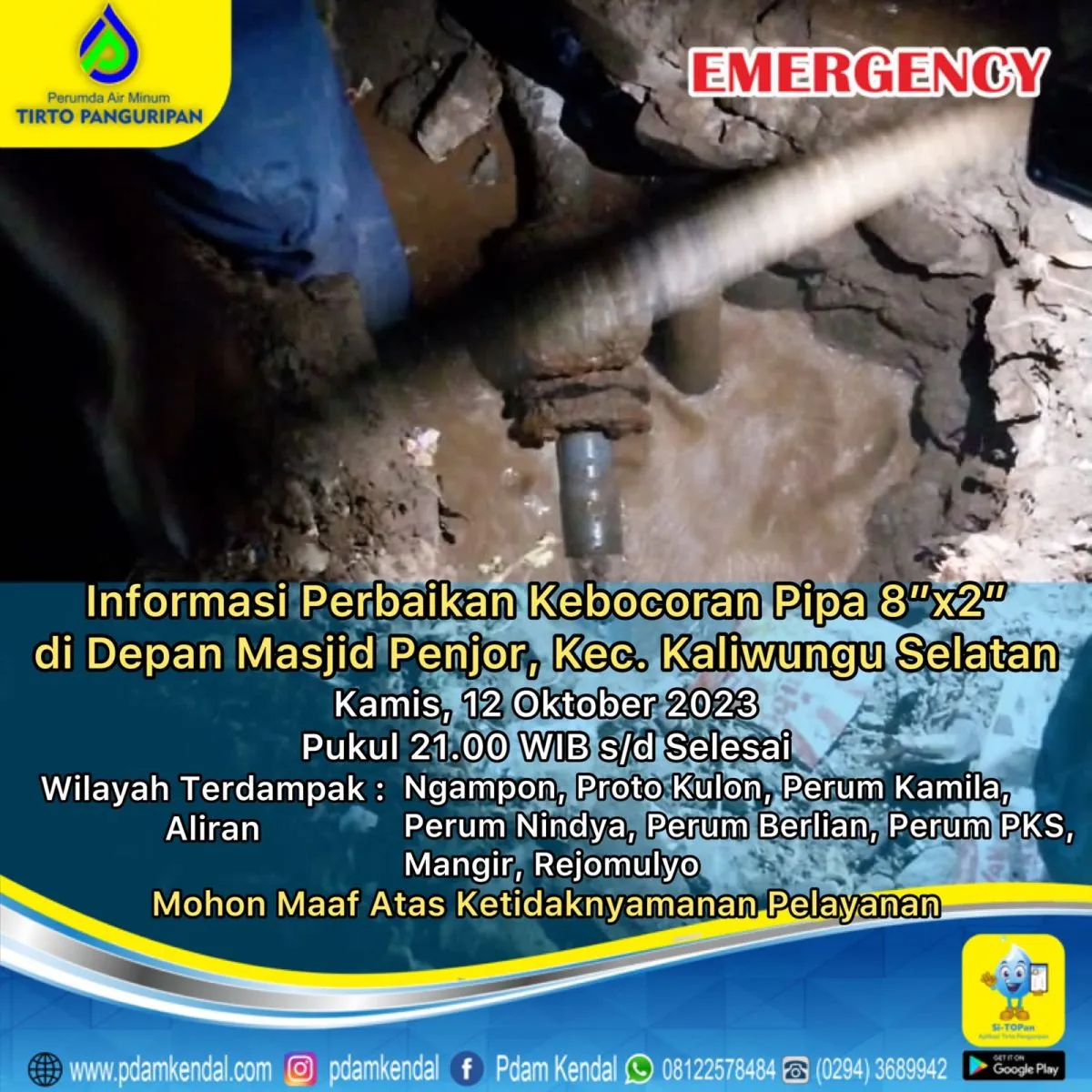 Informasi perbaikan kebocoran pipa 8”x2” di depan Masjid Penjor, Kec. Kaliwungu Selatan. Kamis, 12 Oktober 2023, pukul 21.00 WIB s/d selesai. Hal tersebut akan menyebabkan aliran terganggu