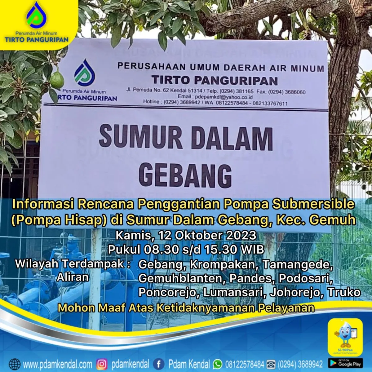 Informasi rencana penggantian pompa submersible (pompa hisap) di Sumur Dalam Gebang, Kec. Gemuh. Kamis, 12 Oktober 2023, pukul 08.30 s/d 15.30 WIB. Hal akan tersebut menyebabkan aliran terganggu