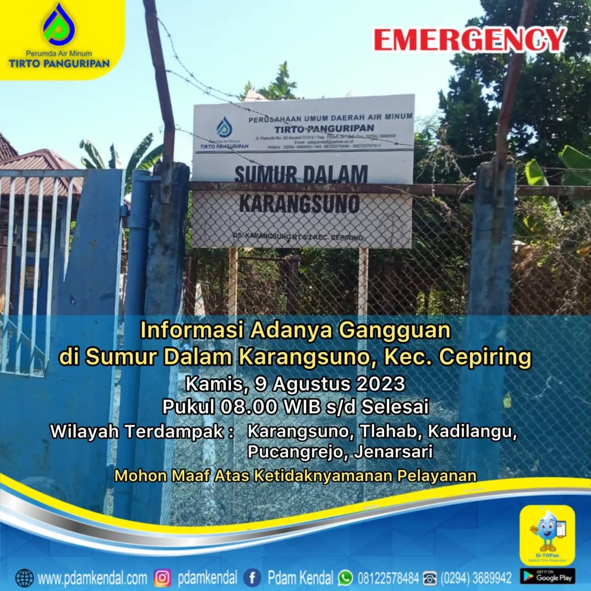Informasi adanya gangguan di Sumur Dalam Karangsuno, Kec. Cepiring. Kamis, 9 Agustus 2023, pukul 08.00 WIB s/d selesai. Hal tersebut menyebabkan aliran terganggu