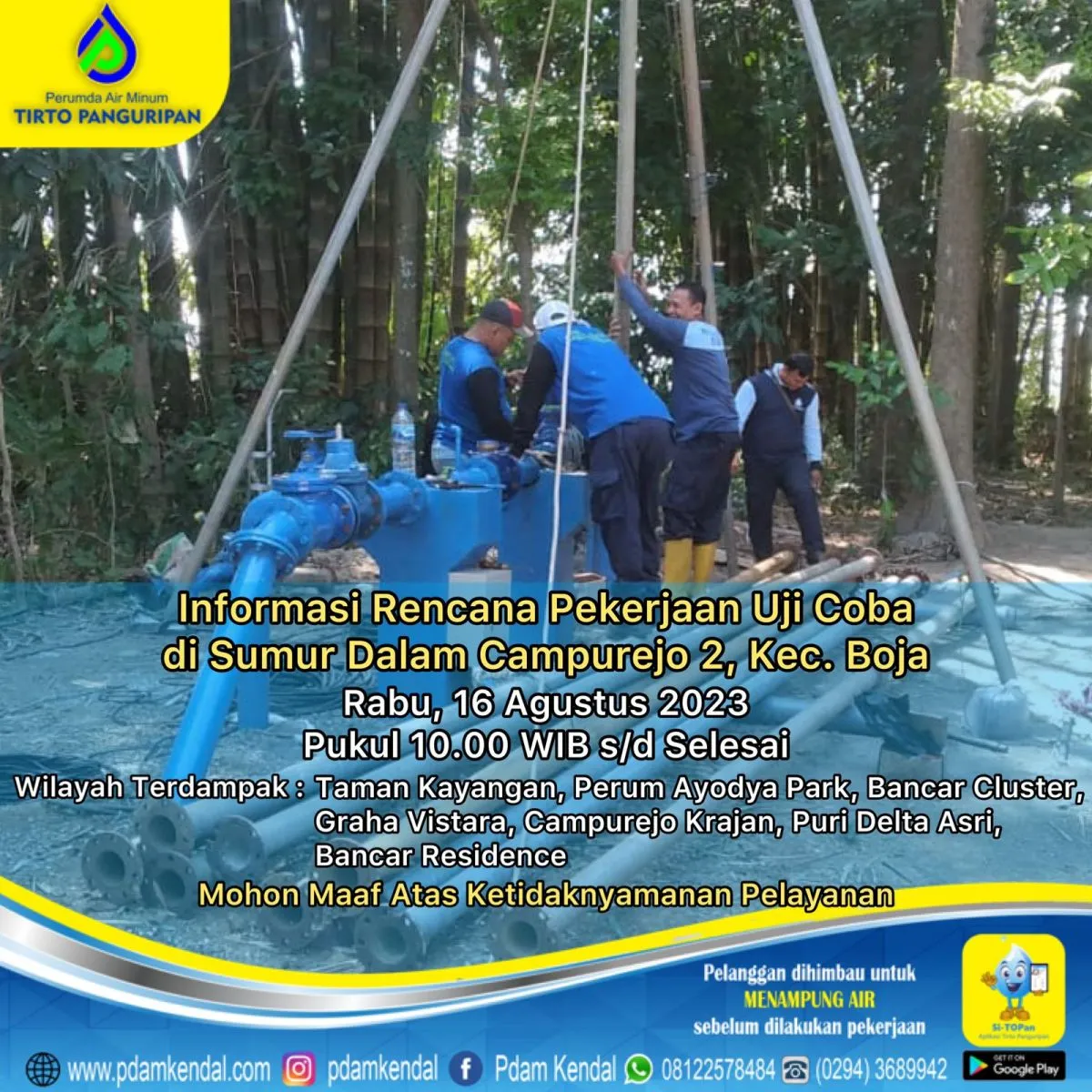 Informasi rencana pekerjaan uji coba di Sumur Dalam Campurejo 2, Kec. Boja Rabu, 16 Agustus 2023, pukul 10.00 WIB s/d selesai. Hal tersebut akan menyebabkan aliran terganggu